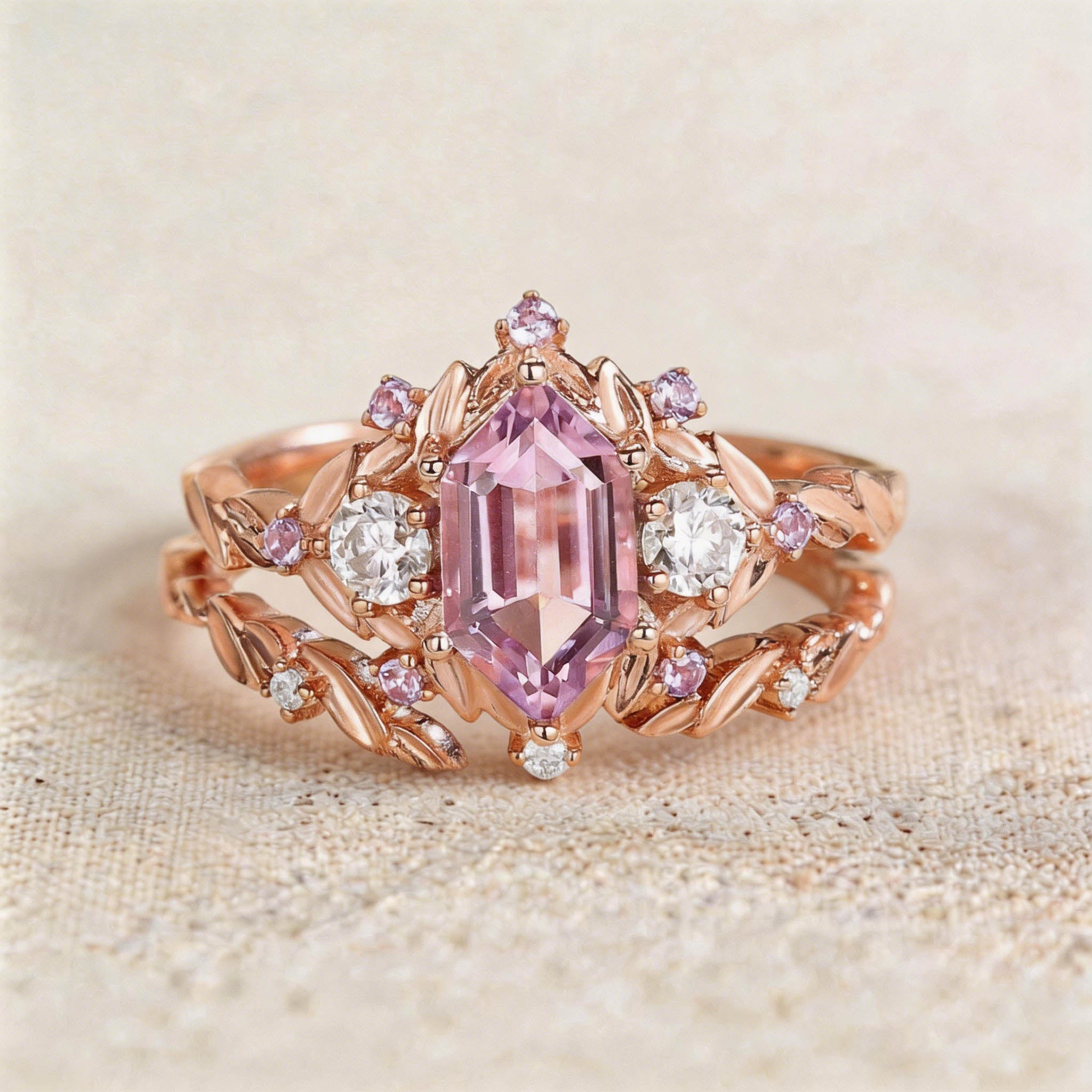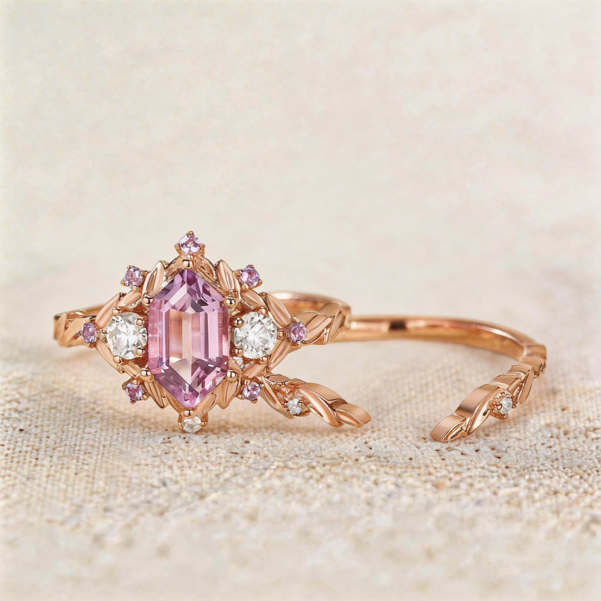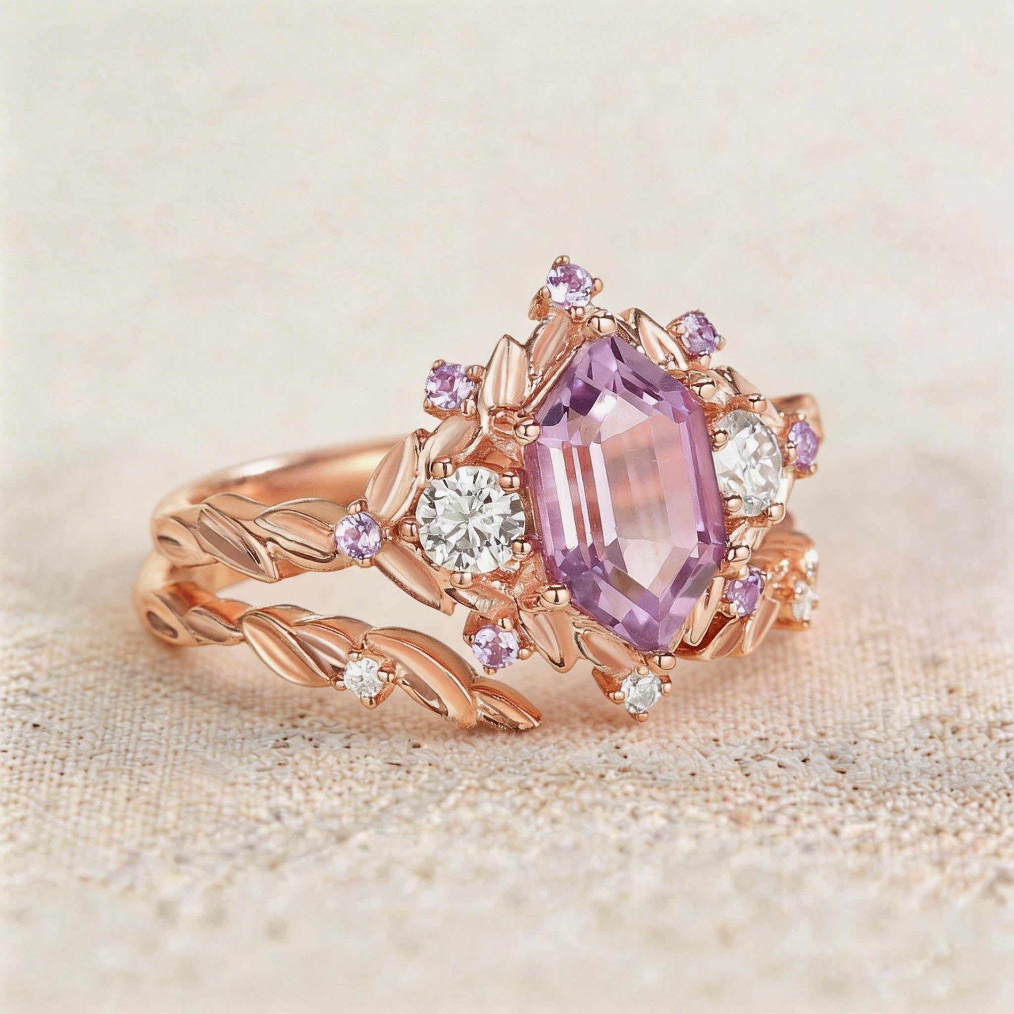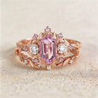Unique floral engagement rings long hexagon Lab Padparadscha and amethyst cluster wedding ring set