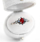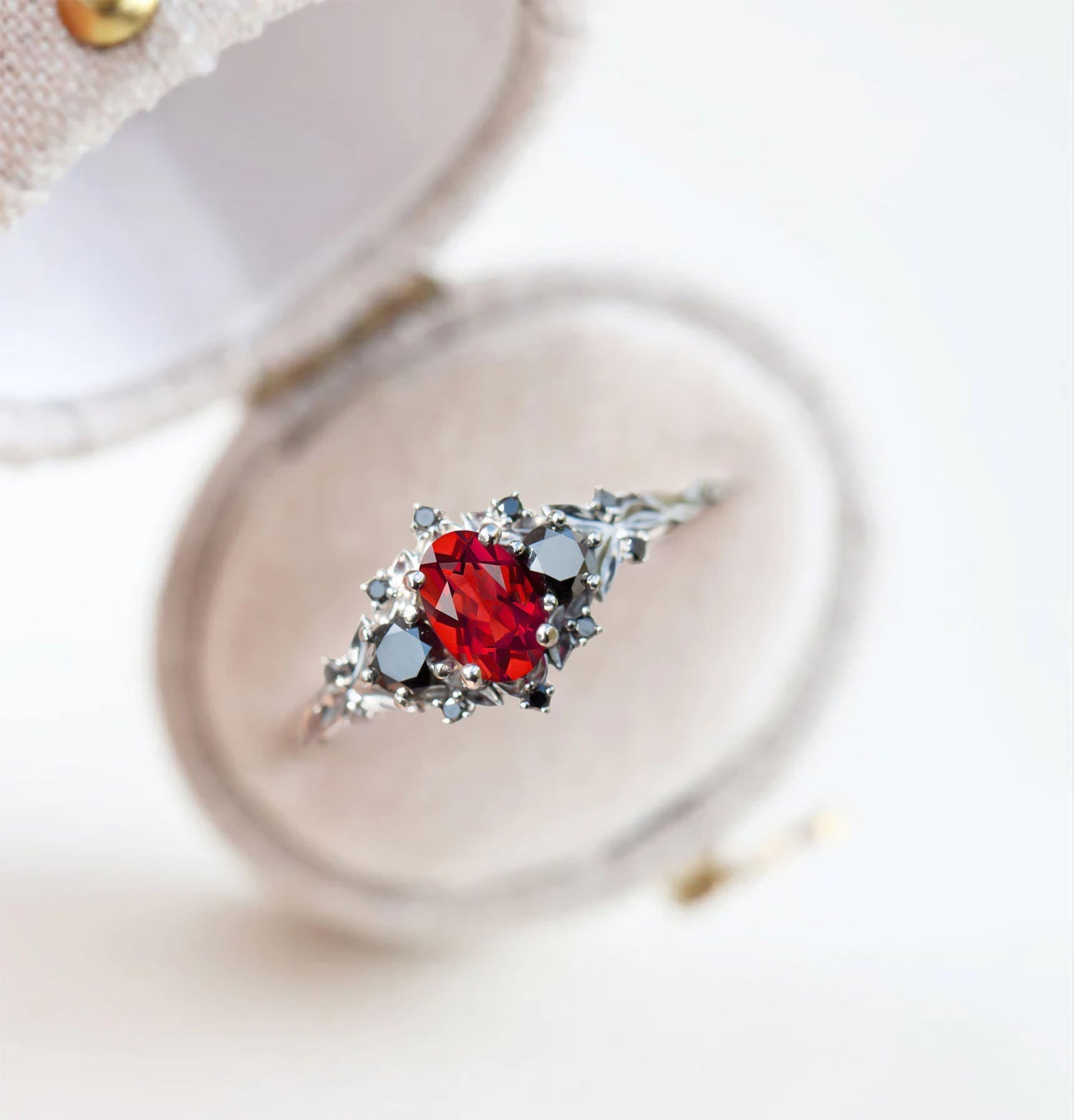Unique Briar Rose Three Stone Oval Garnet and Black Moissanite Anniversary Ring