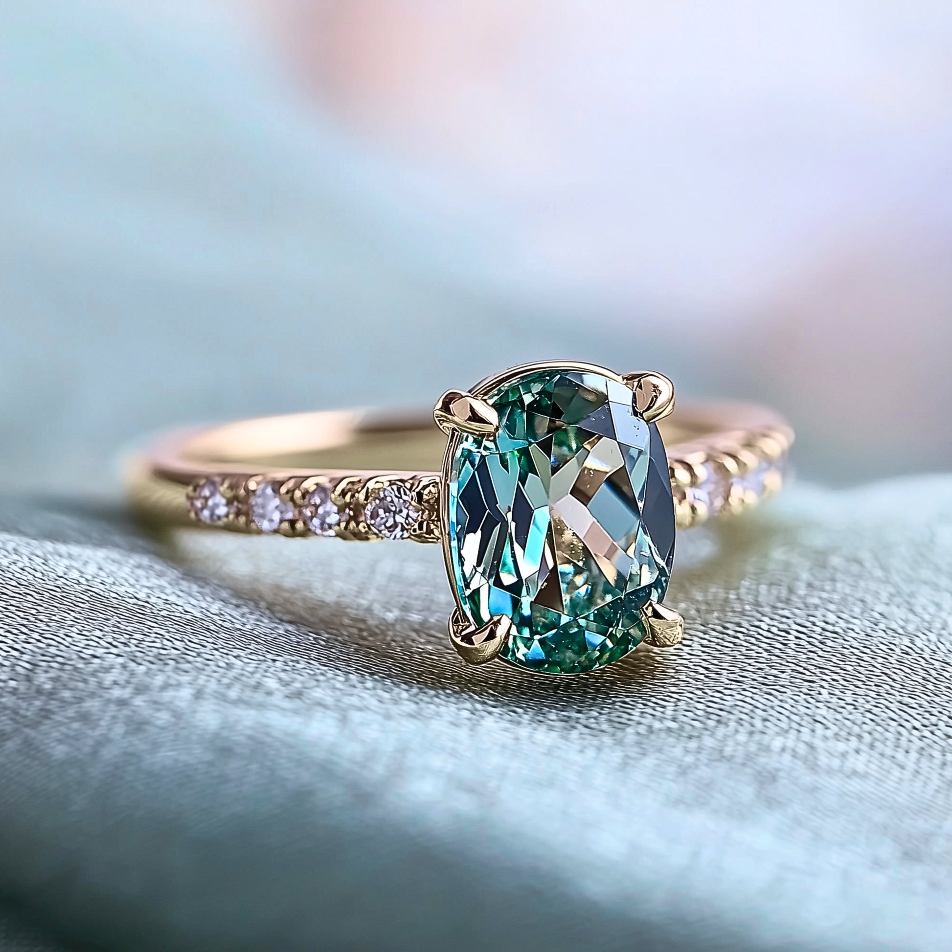 This is the kind of ring that's about to become your new favorite accessory. The star of the show is a captivating oval-cut stone in a dreamy green hue — so pretty, you might catch yourself staring at your hand more often than usual.