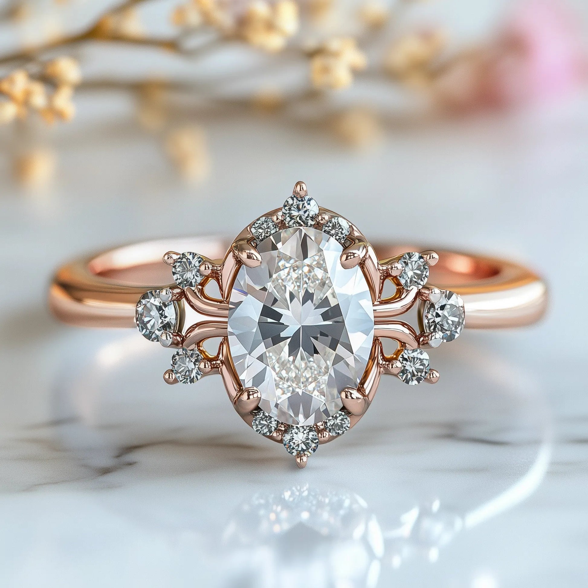 This ring embodies elegance and simplicity. Its oval-cut center stone, surrounded by a delicate halo of smaller gems, catches the light with a sparkling brilliance that’s eye-catching yet effortlessly graceful.