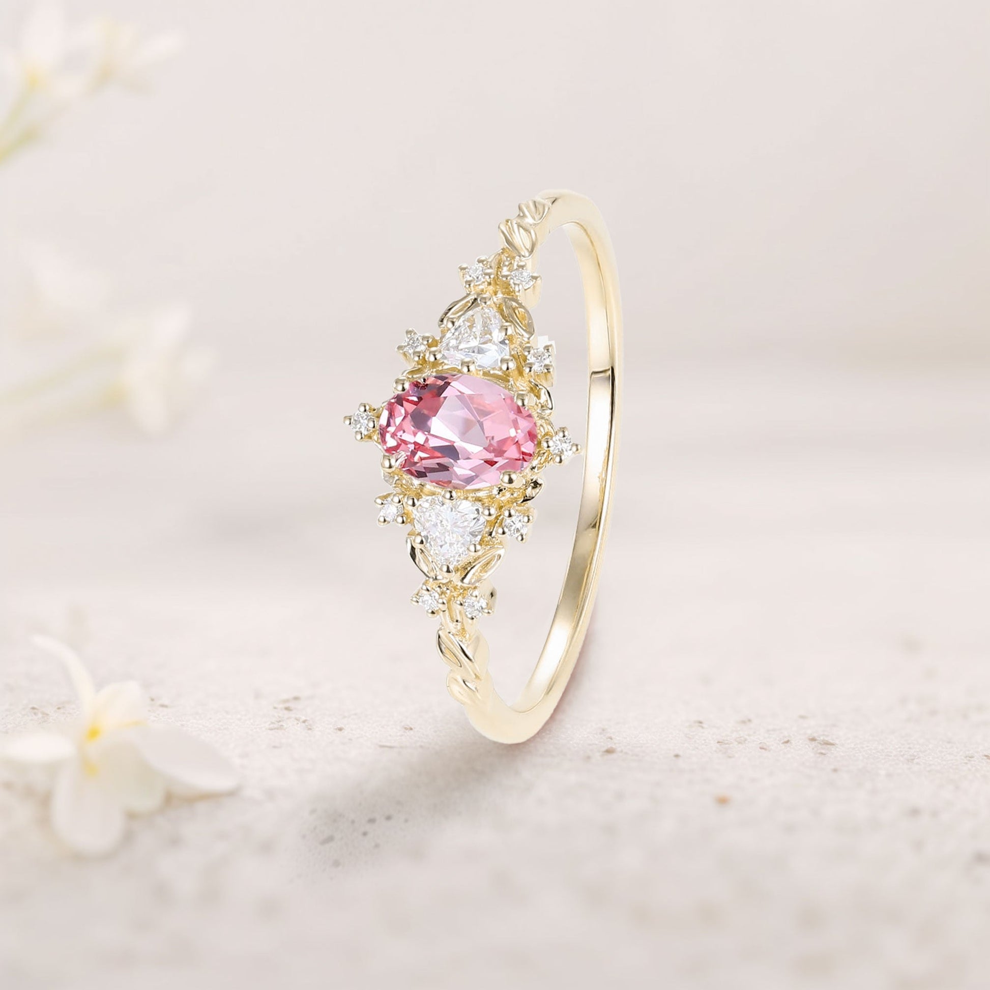 Classic Briar Rose Oval Pink Lab Padparadscha Olive Leaves Engagement Ring Fairy Ring