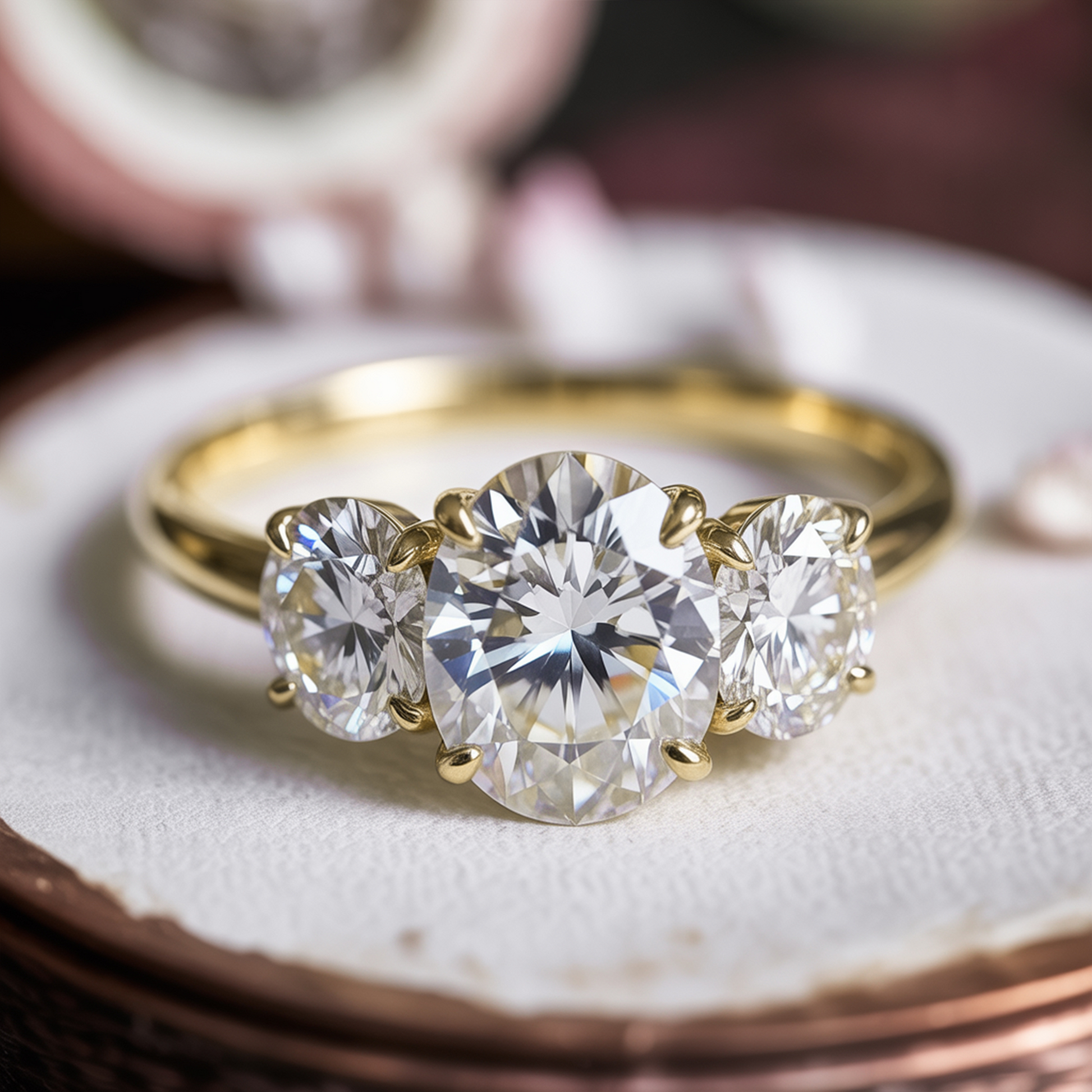 Celebrate your story with timeless brilliance. This three-stone design features a captivating 2CT oval moissanite at the center, flanked by two smaller stones to represent your past, present, and future. The result is a harmonious, radiant look full of symbolism and sparkle.
