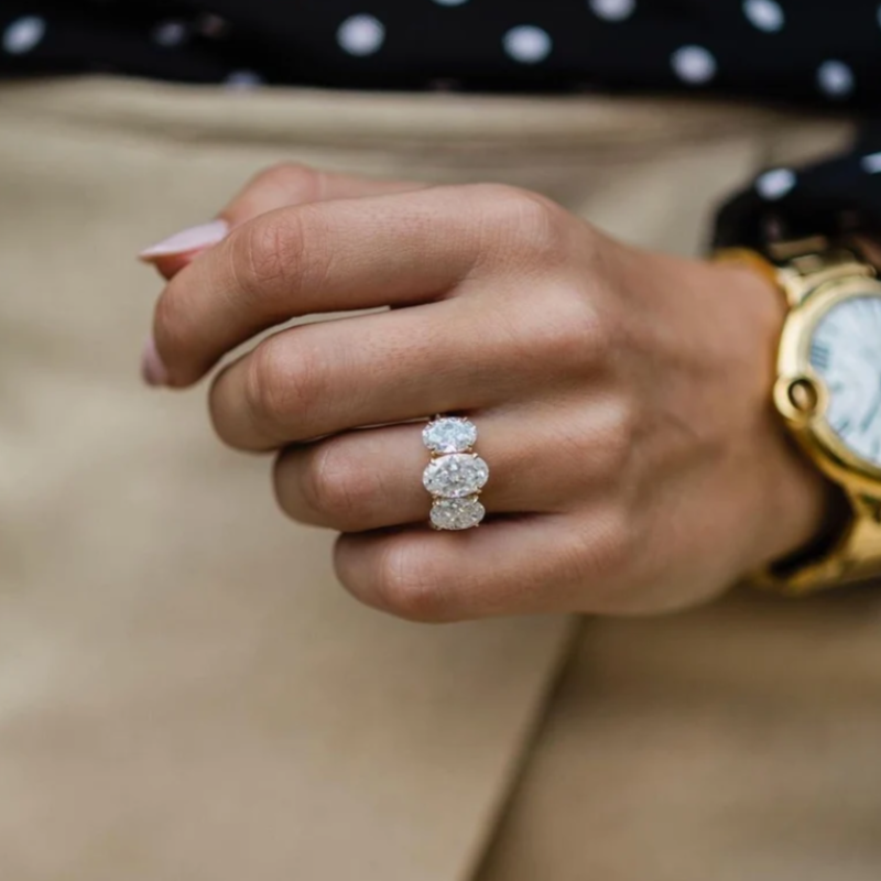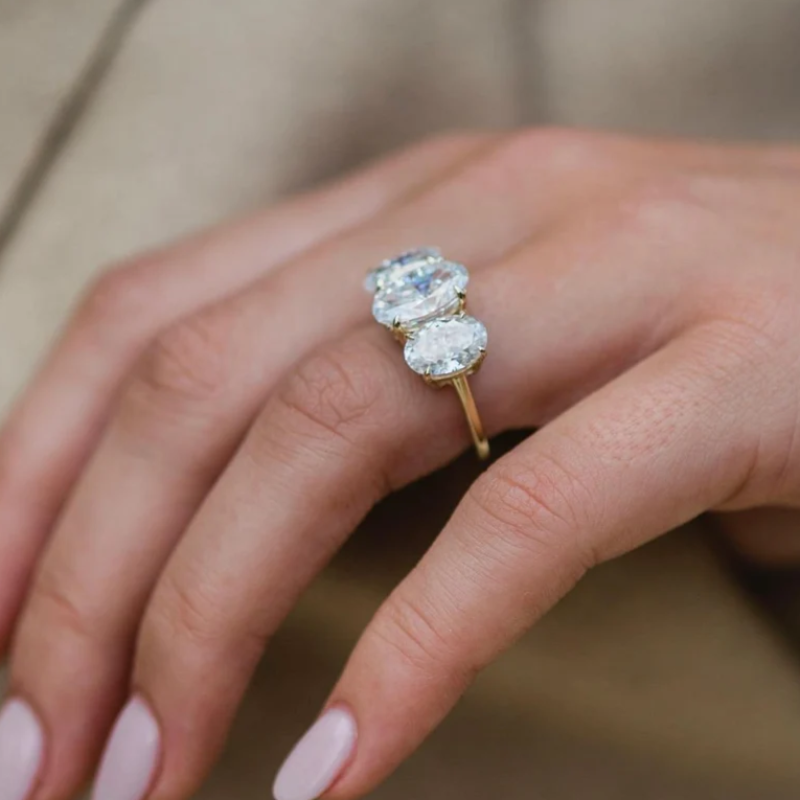 Our Three-Stone Oval Cut Engagement Ring is a timeless symbol of commitment and celebration. Crafted in Sterling Silver, each stone is delicately nestled, radiating brilliance and grace. Perfect for marking your special moments and milestones.