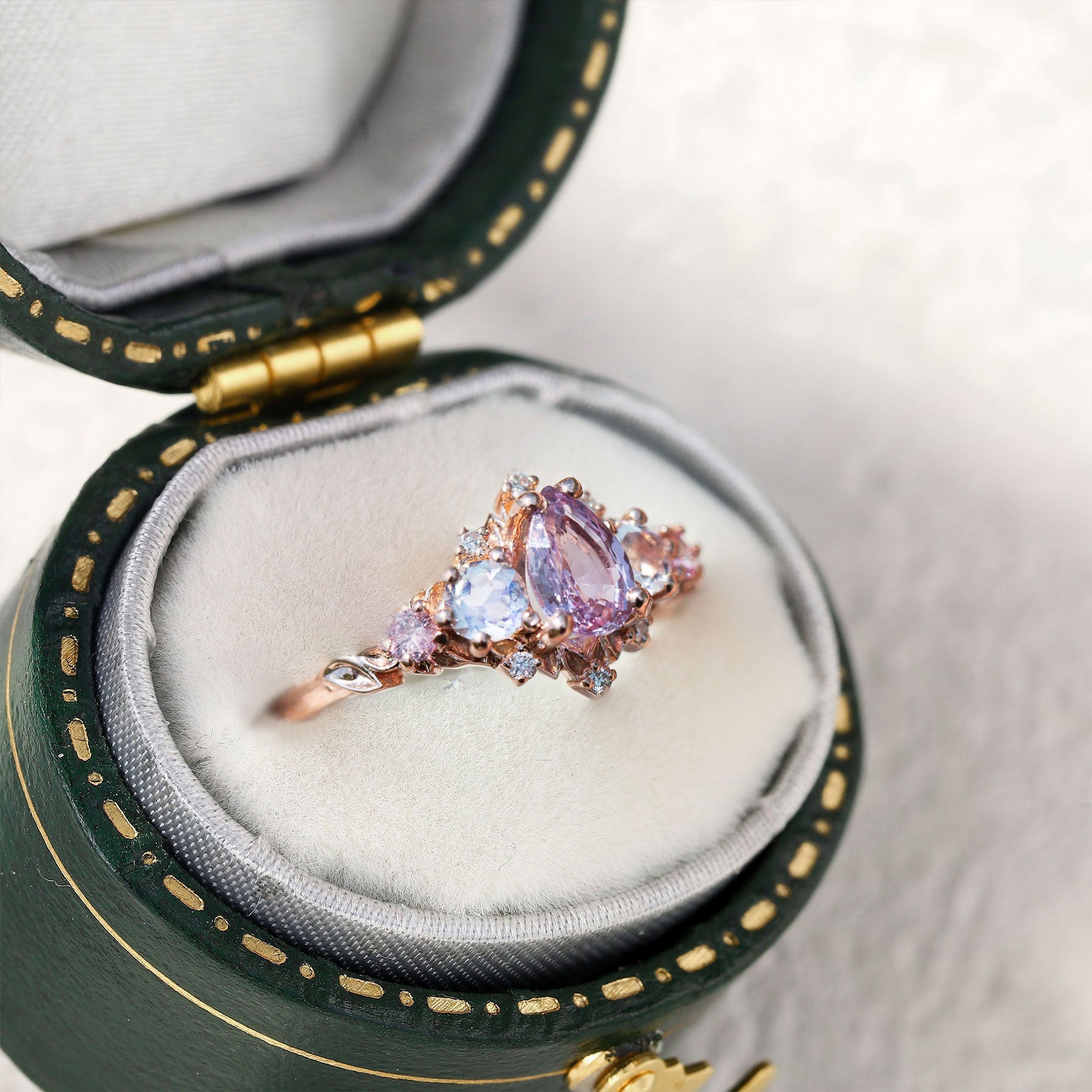 Unique Briar Rose Five Stone Pear Lab Padparadscha Ring