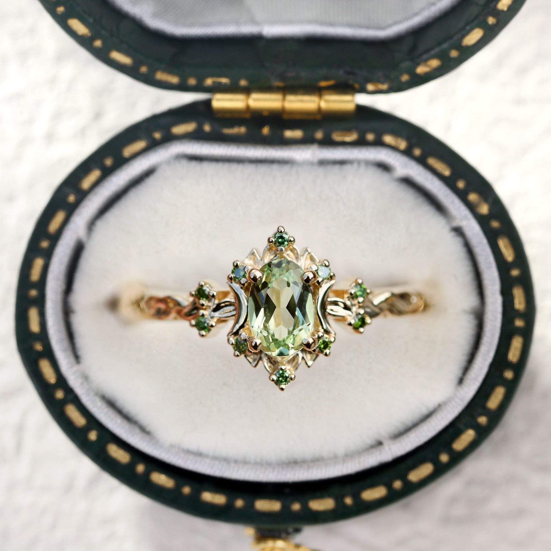 Unique Briar Rose Halo Moon Oval Green Lab Sapphire Ring