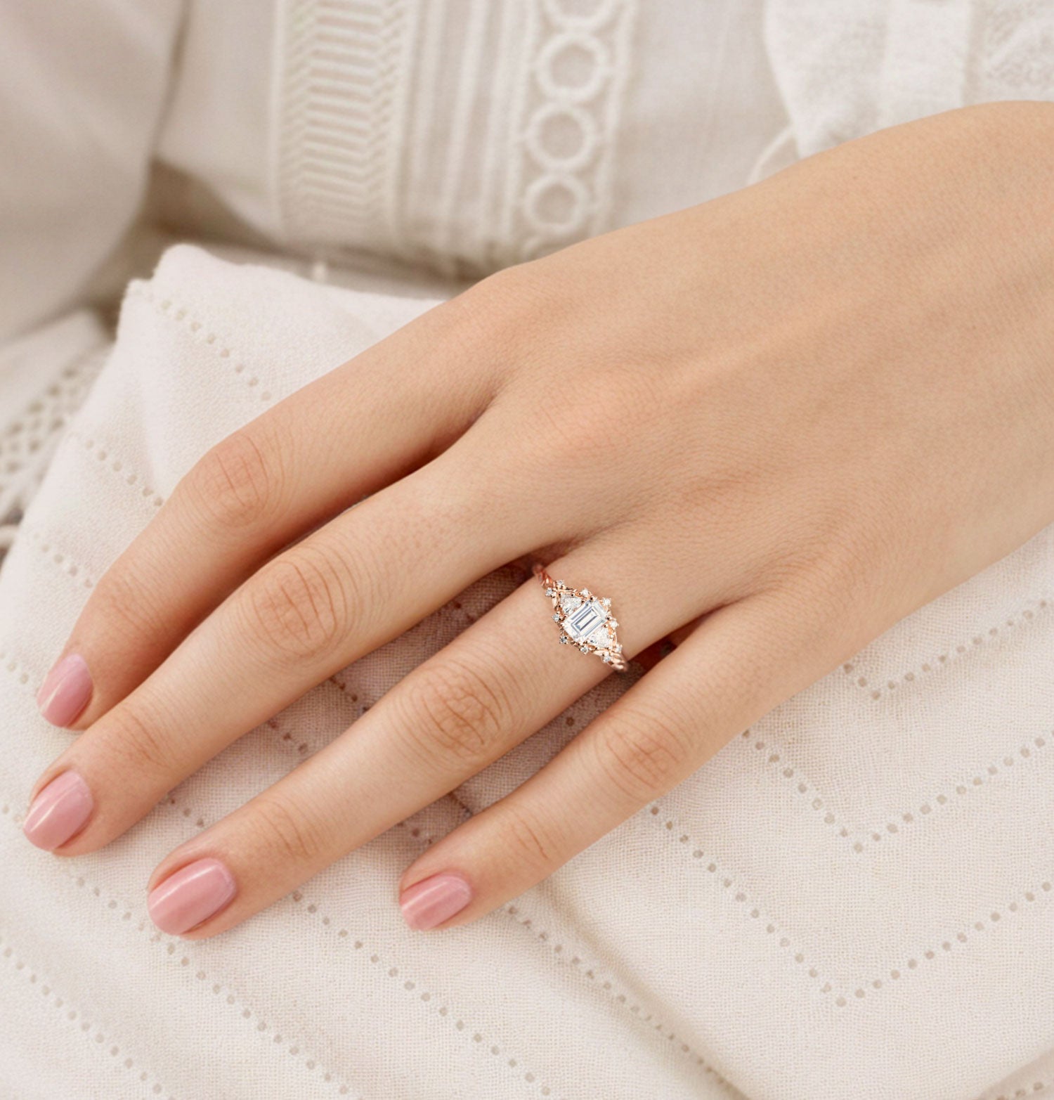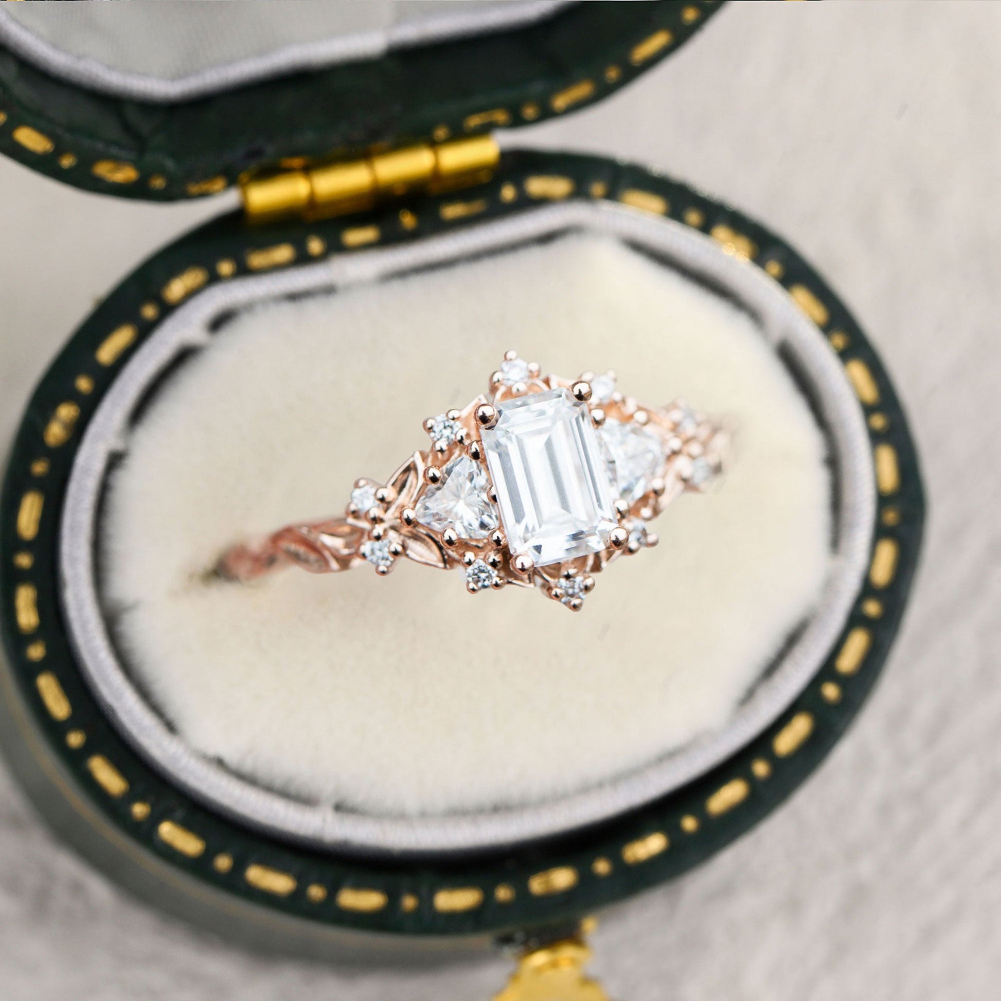 Unique Briar Rose Three Stone Emerald cut Moissanite Ring