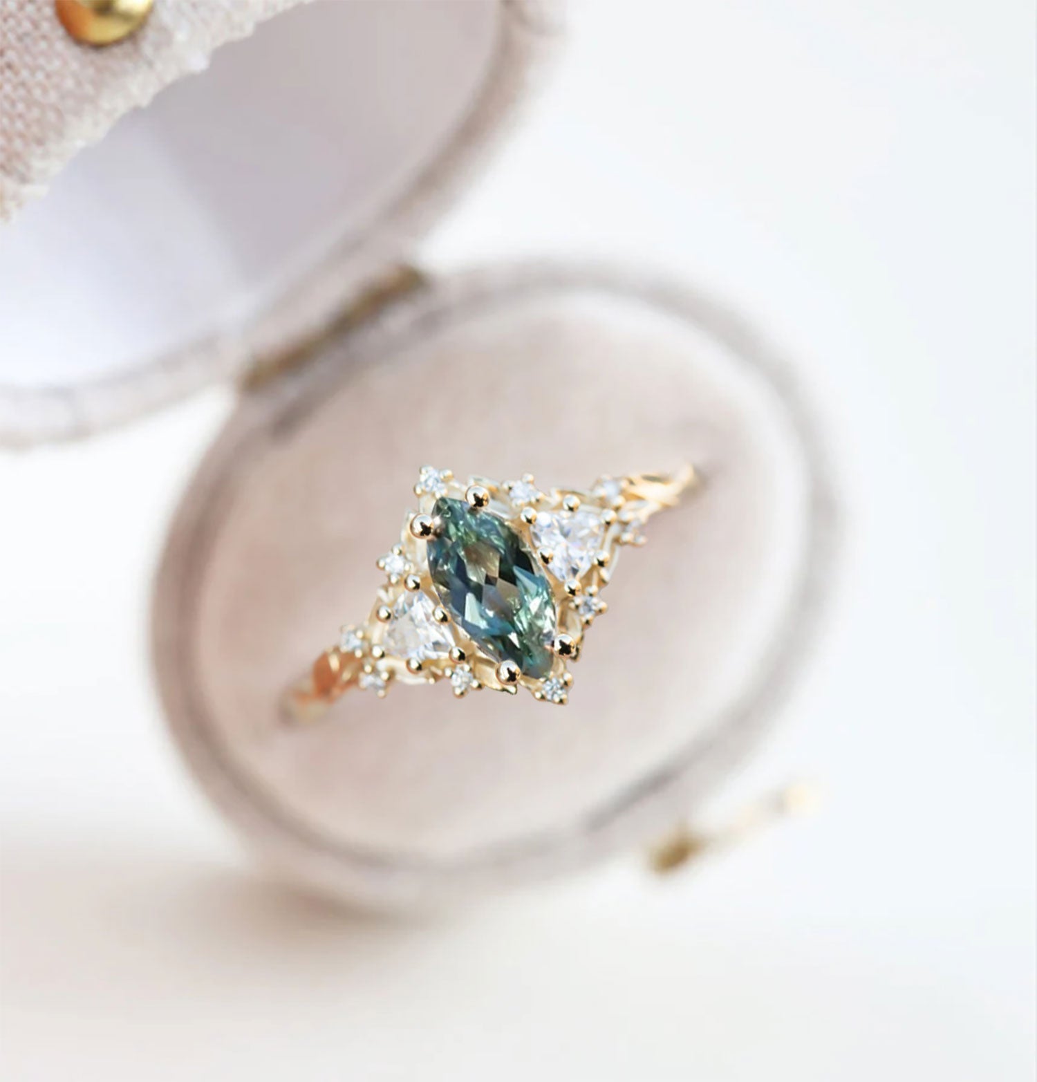 Unique Briar Rose Three Stone Marquise Green Lab Sapphire and Moissanite Ring