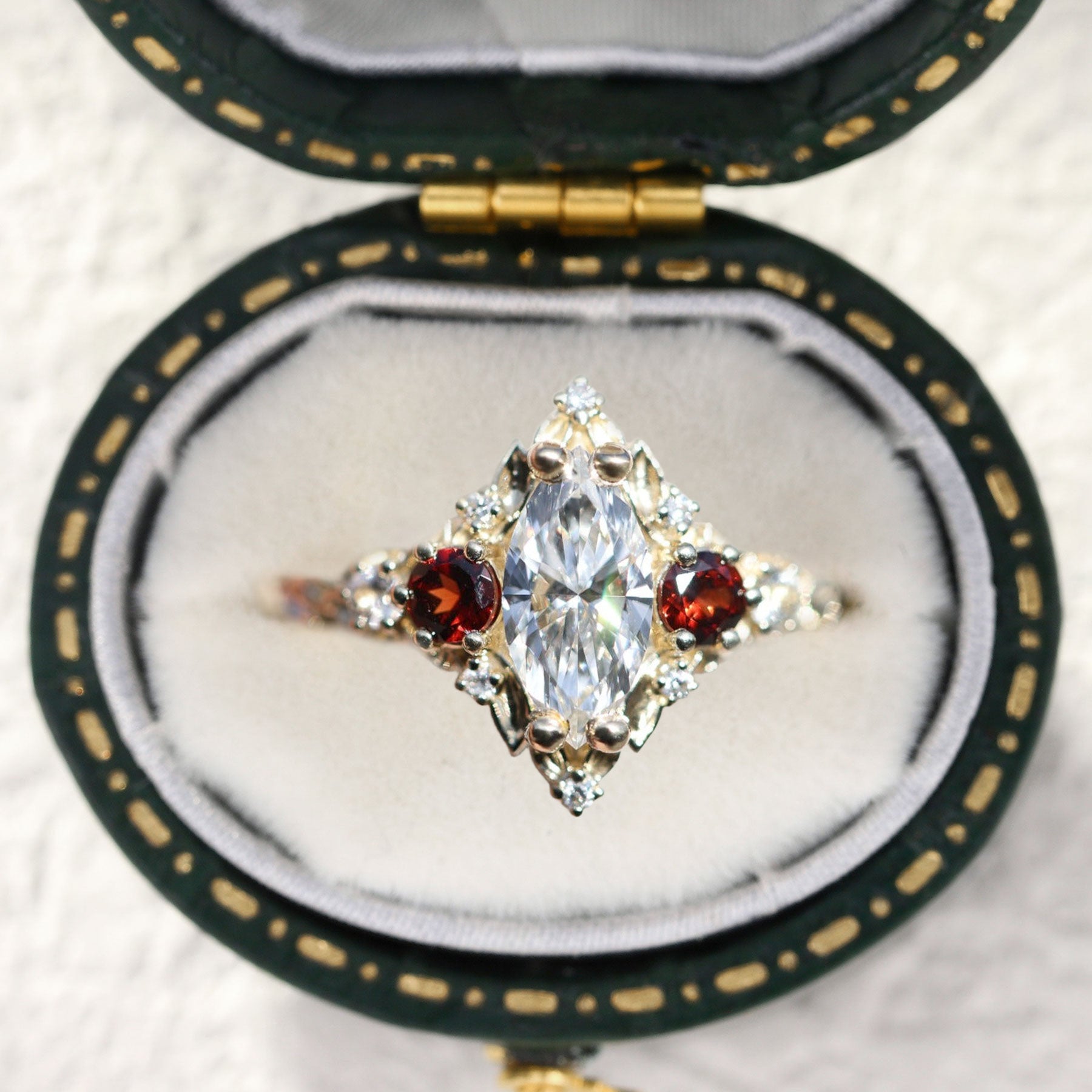 Unique Briar Rose Three Stone Marquise Moissanite and Lab Ruby Ring