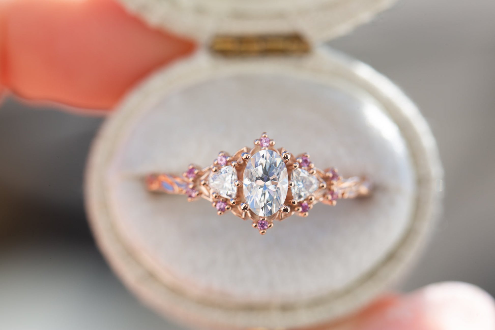 Unique Briar Rose Three Stone Oval Moissanite and Pink Sapphire Ring