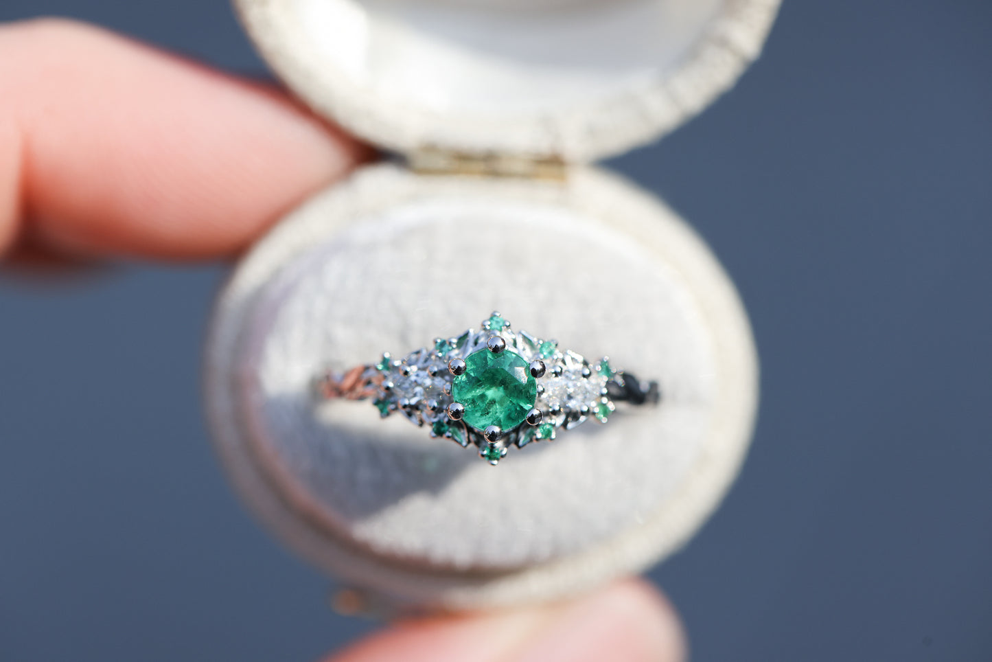Unique Briar Rose Three Stone Round Lab Emerald Ring