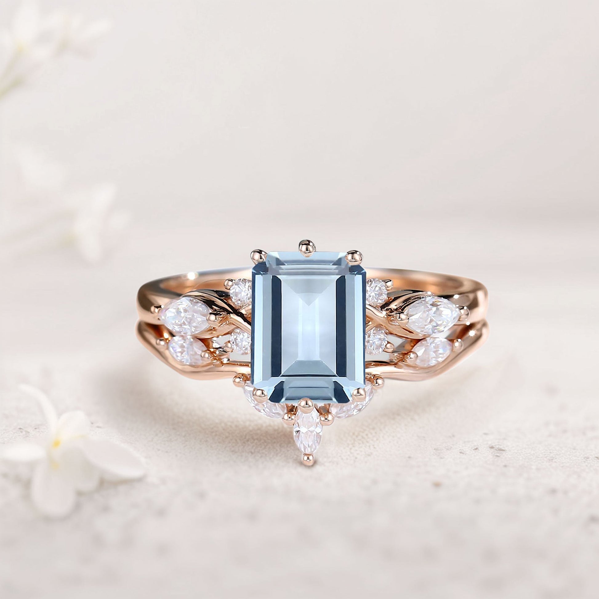 Unique Emerald Shaped Lab Aquamarine Wedding Ring Set Bridal Ring Set