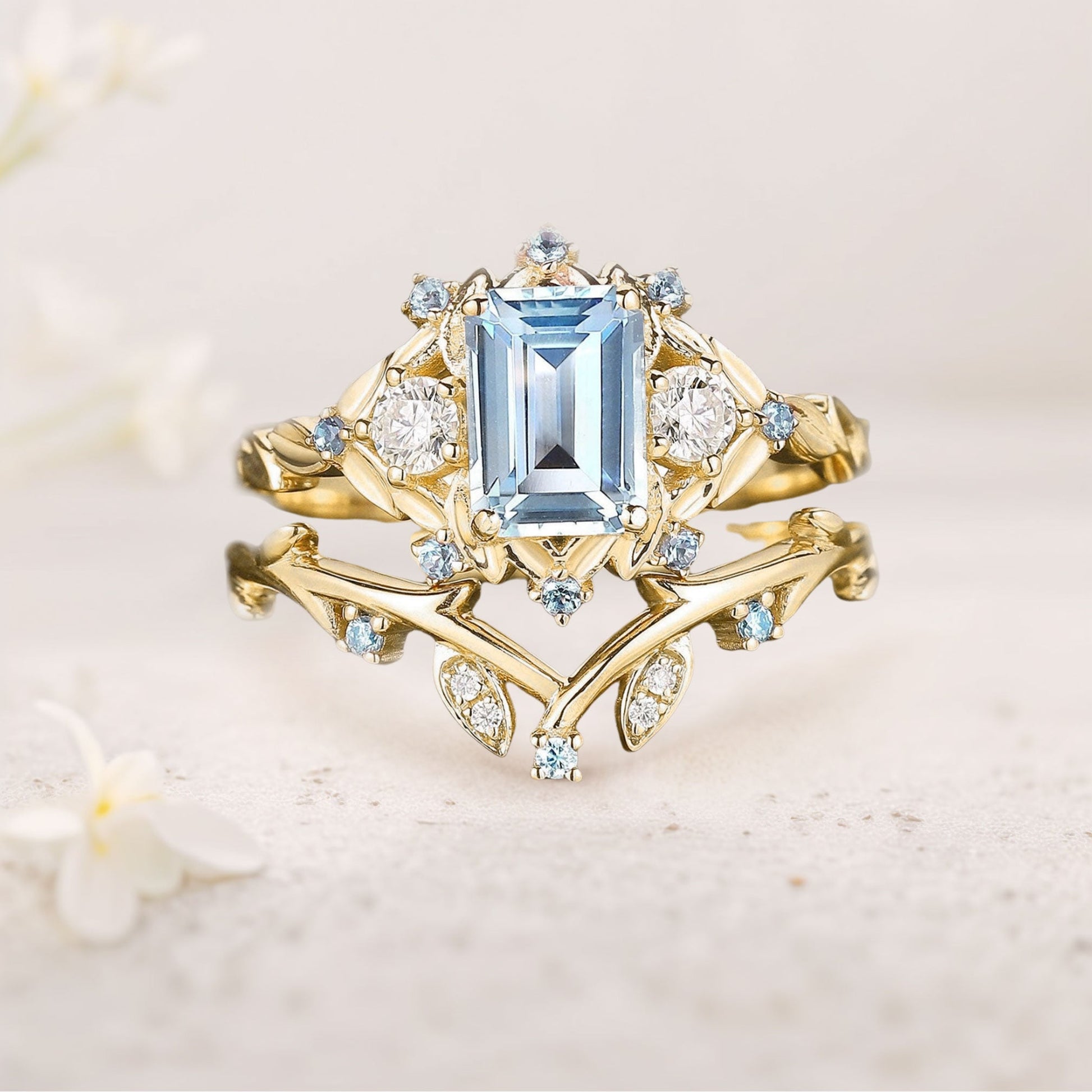 Unique floral engagement rings Emerald Cut Lab Aquamarine Floral Wedding Ring Promise Bridal Set