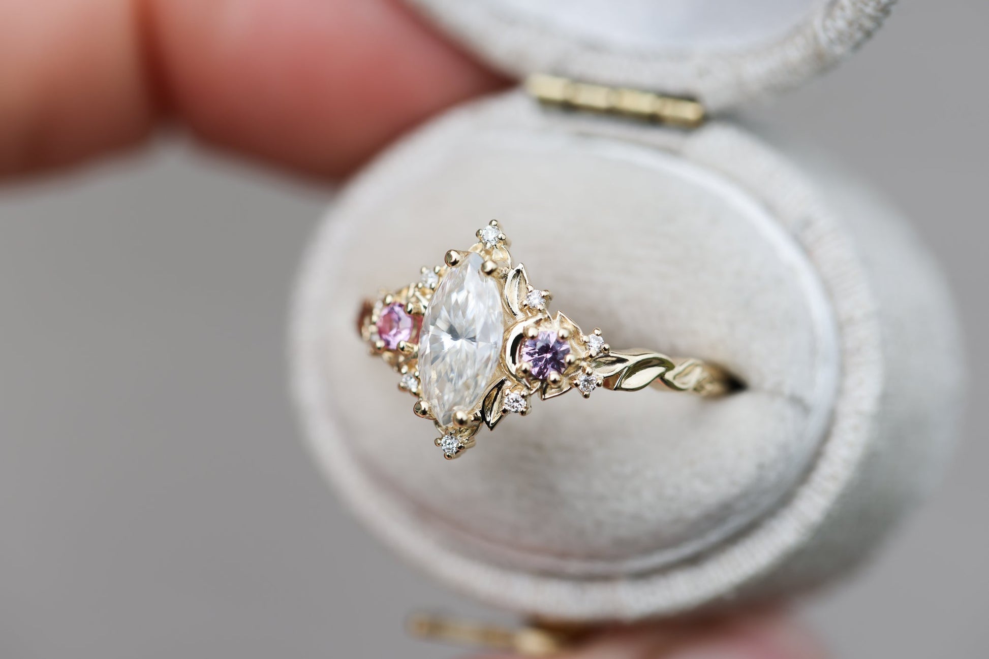Unique floral engagement rings Moon Three Stone Marquise Moissanite Ring