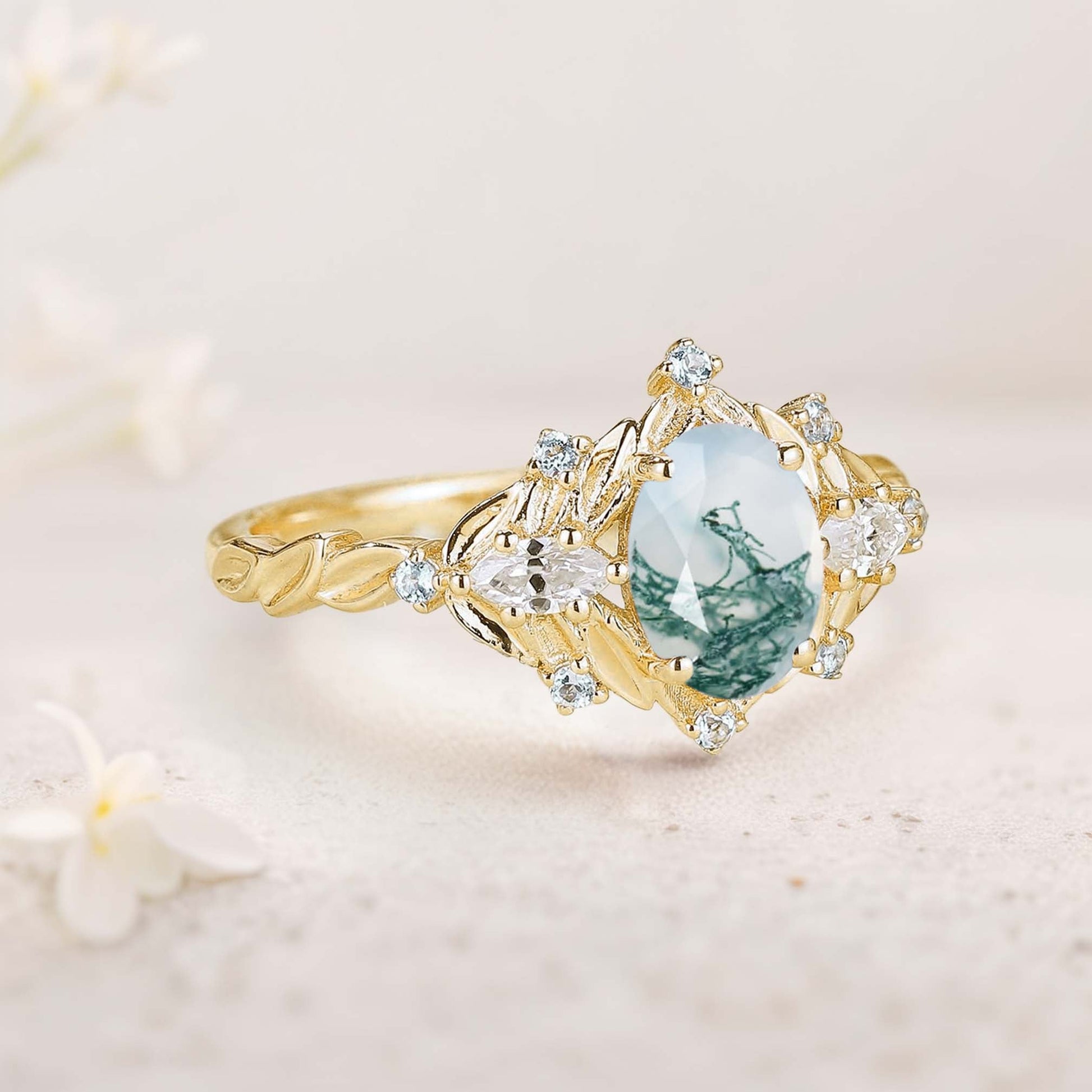 Unique floral engagement rings Oval Moss Agate Fairy Engagement Ring Art Deco Blue Topaz Cluster Wedding Ring