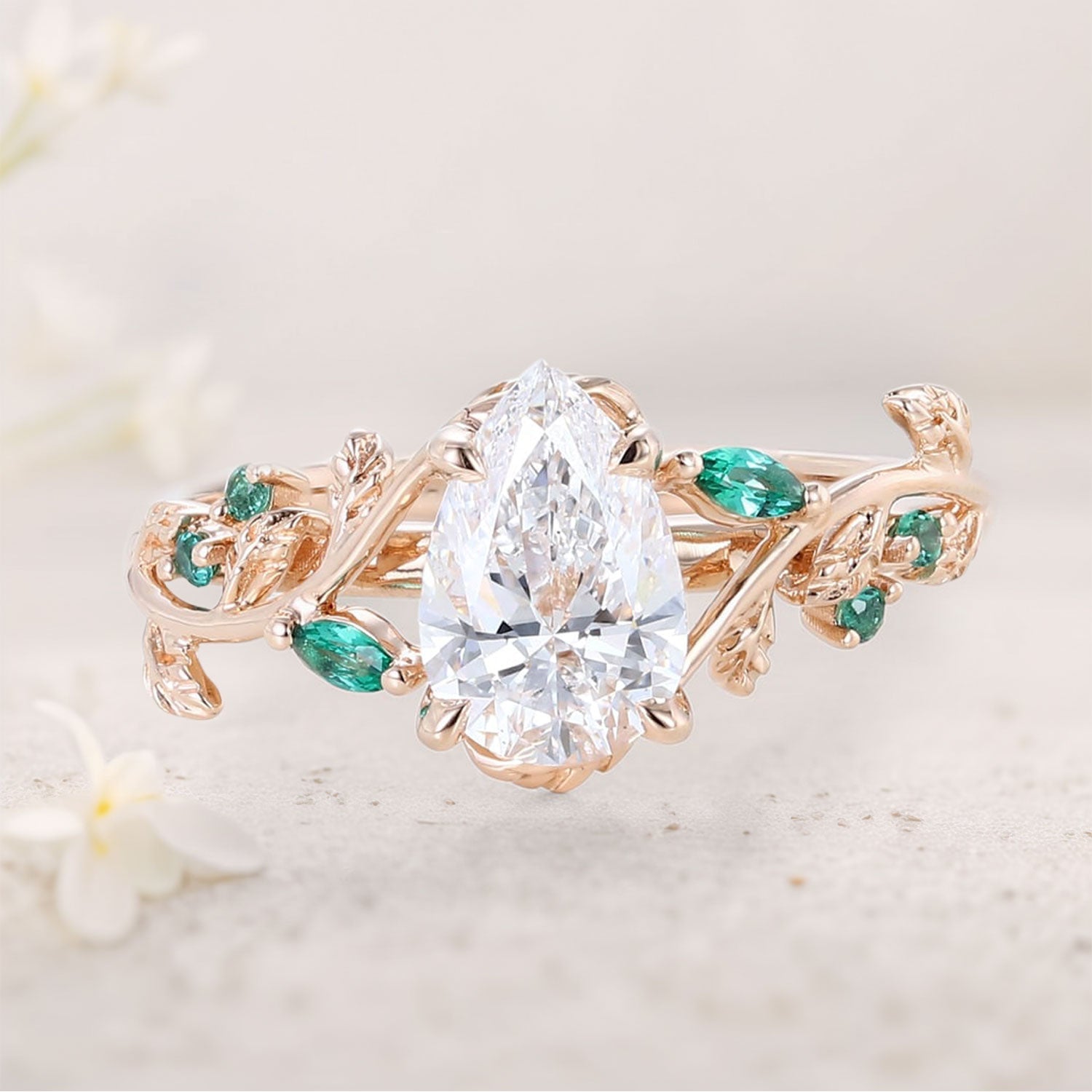 Unique floral engagement rings Pear Moissanite and Emerald Engagement Ring