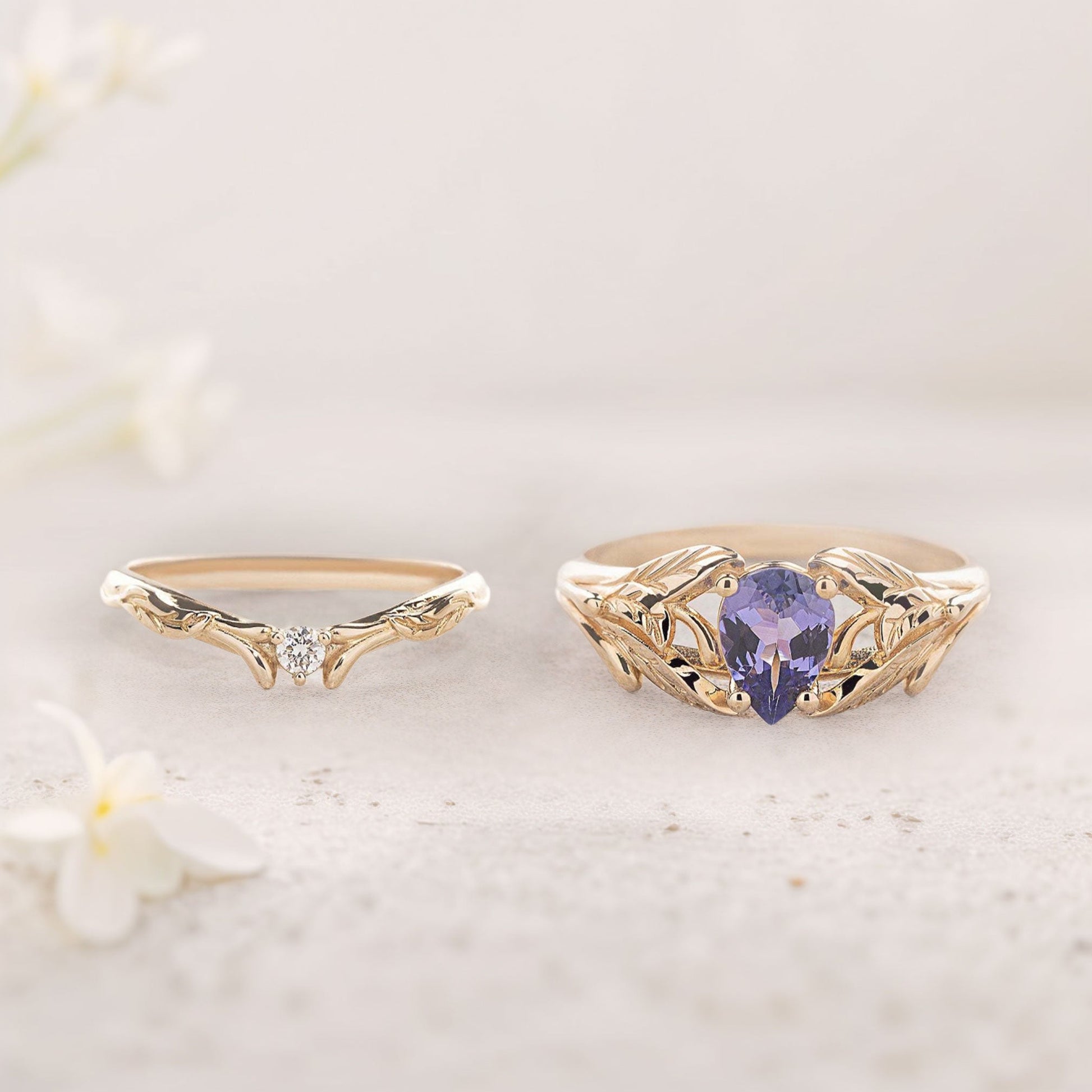 Unique floral engagement rings Pear Purple Lab Tanzanite engagement ring with Moissanite wedding Set