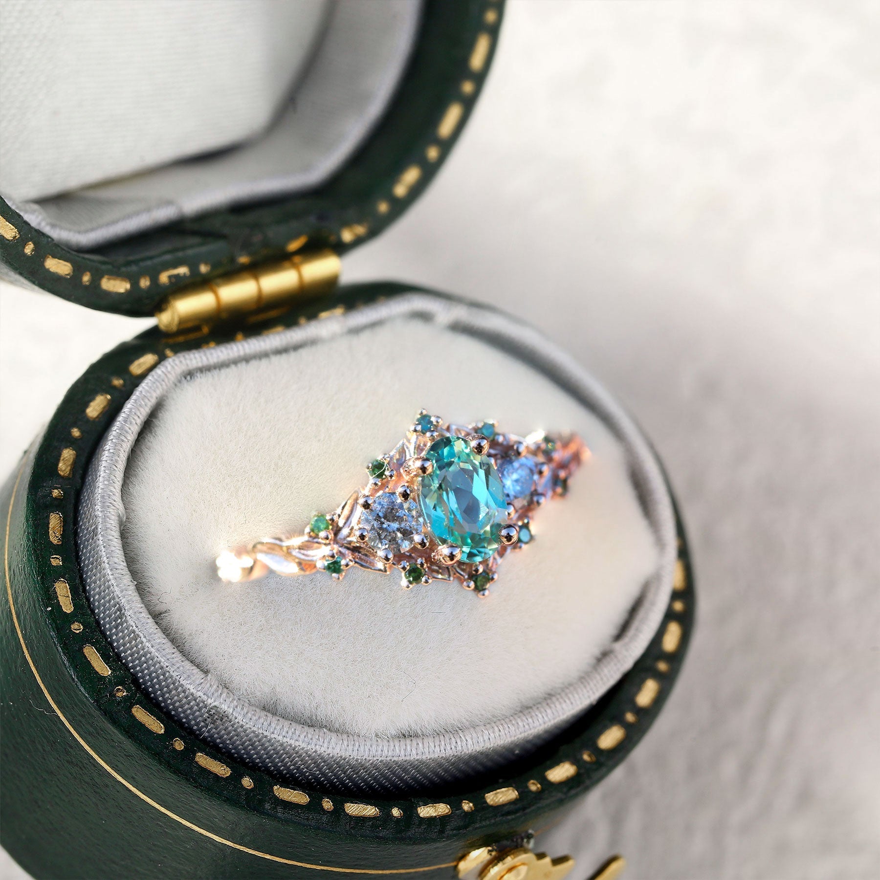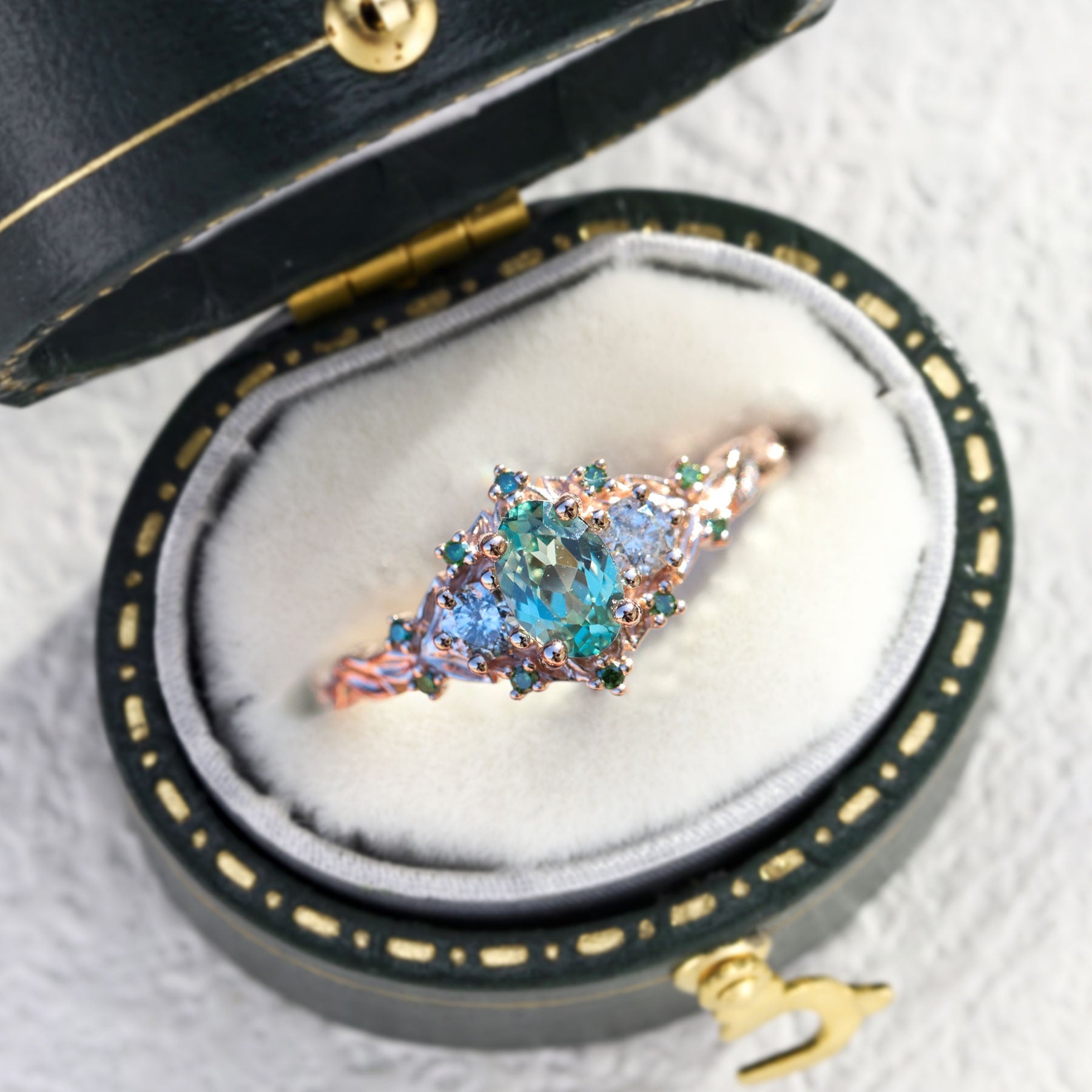 Unique floral engagement rings Rose Three-Stone Oval Green Lab Sapphire Ring