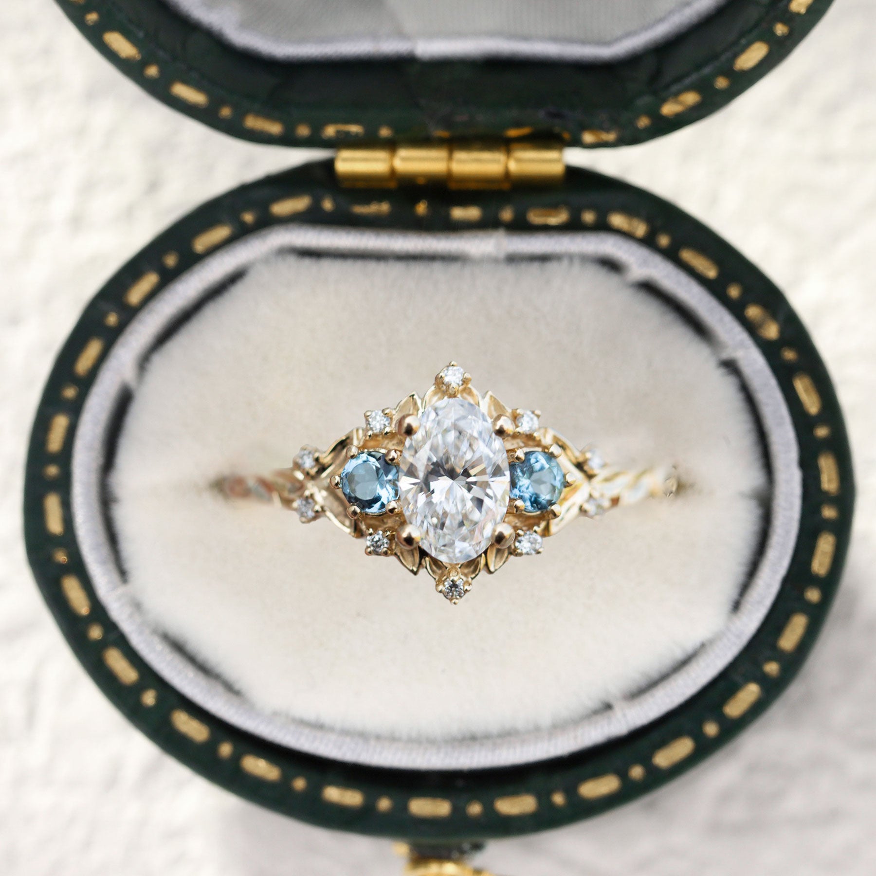 Unique floral engagement rings Rose Three-Stone Oval Moissanite and Lab Topaz Ring