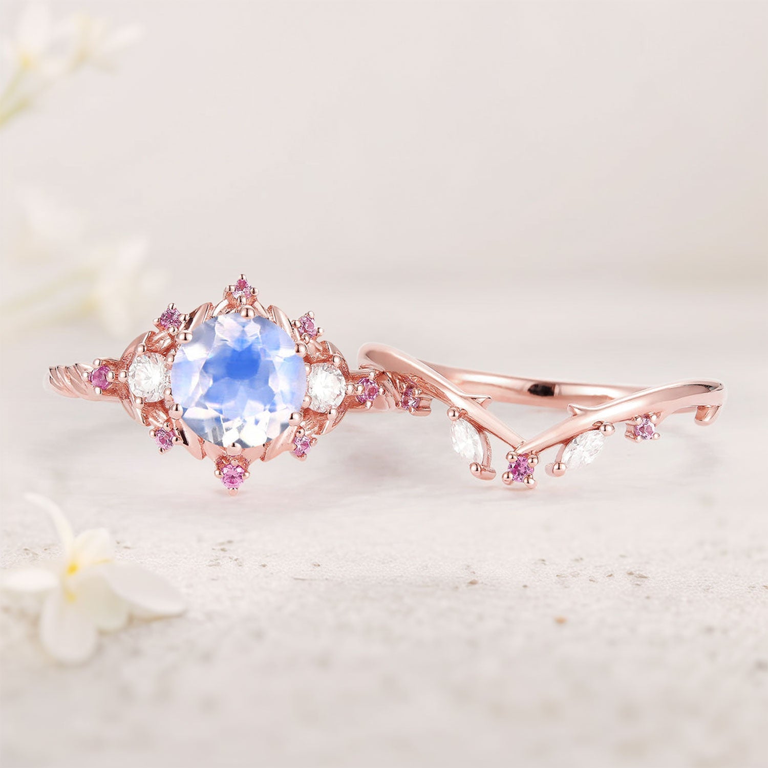Unique floral engagement rings Round Lab Moonstone and Moissanite Ring Set