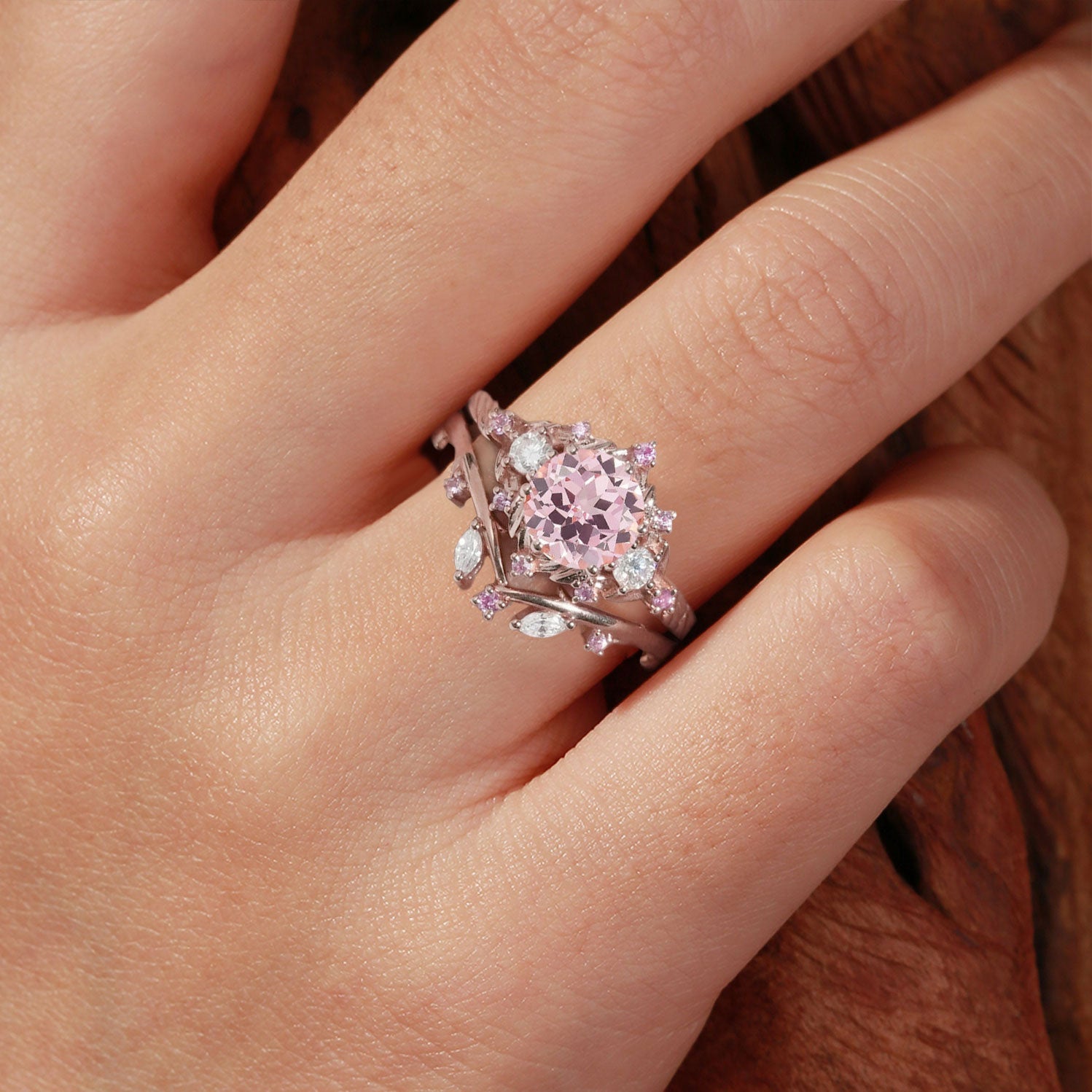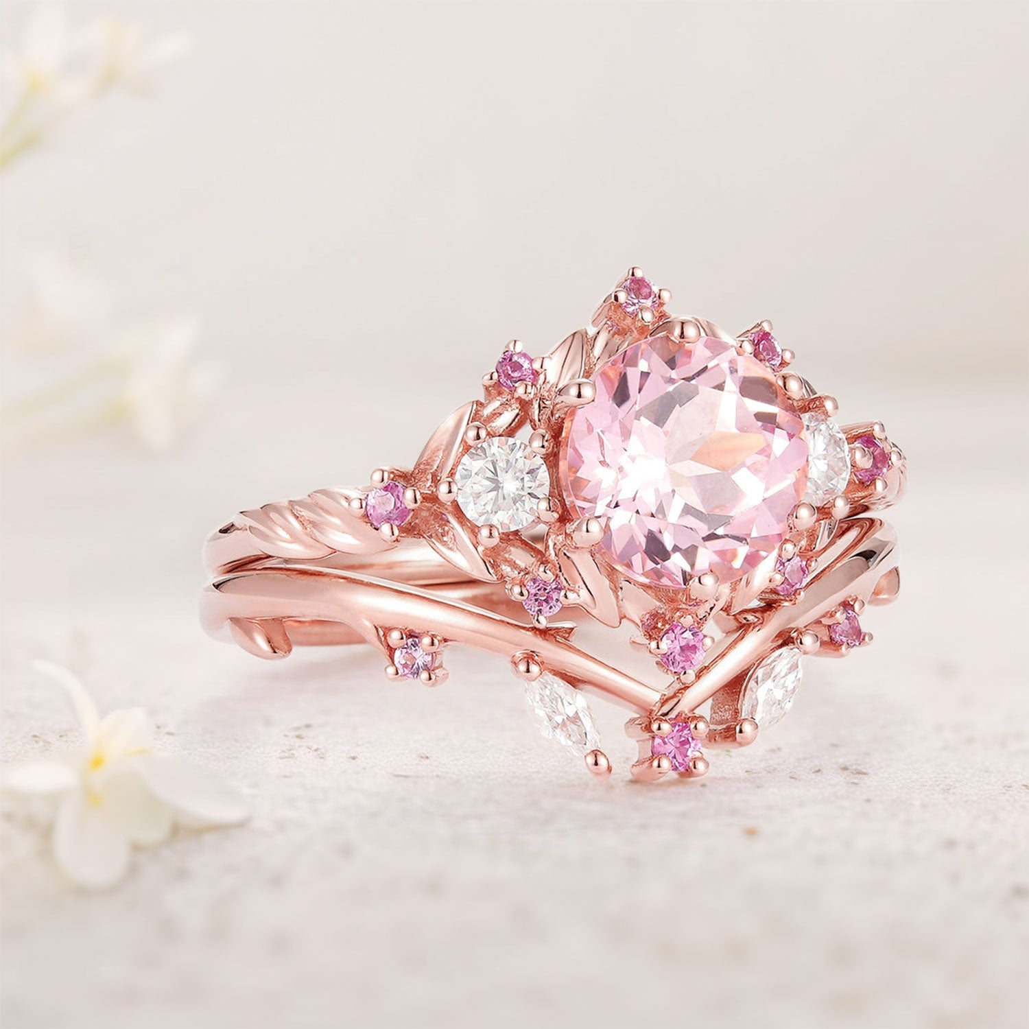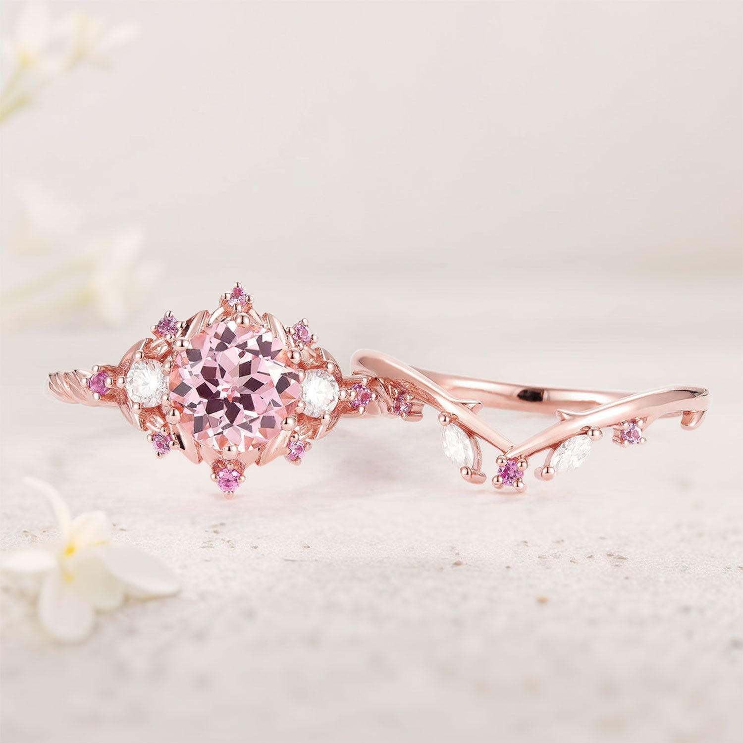 Unique floral engagement rings Round Lab Padparadscha and Moissanite Engagement Ring Set
