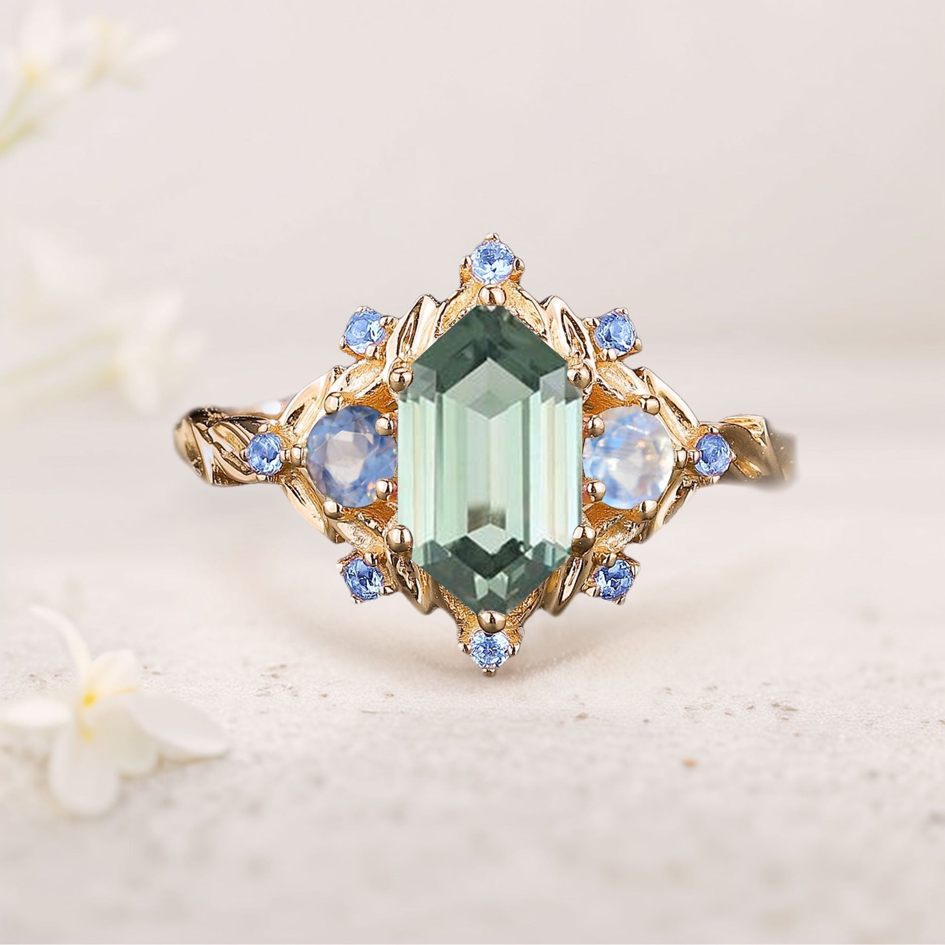 Unique floral engagement rings Three Stone Hexagon Green Lab Sapphire Engagement Ring