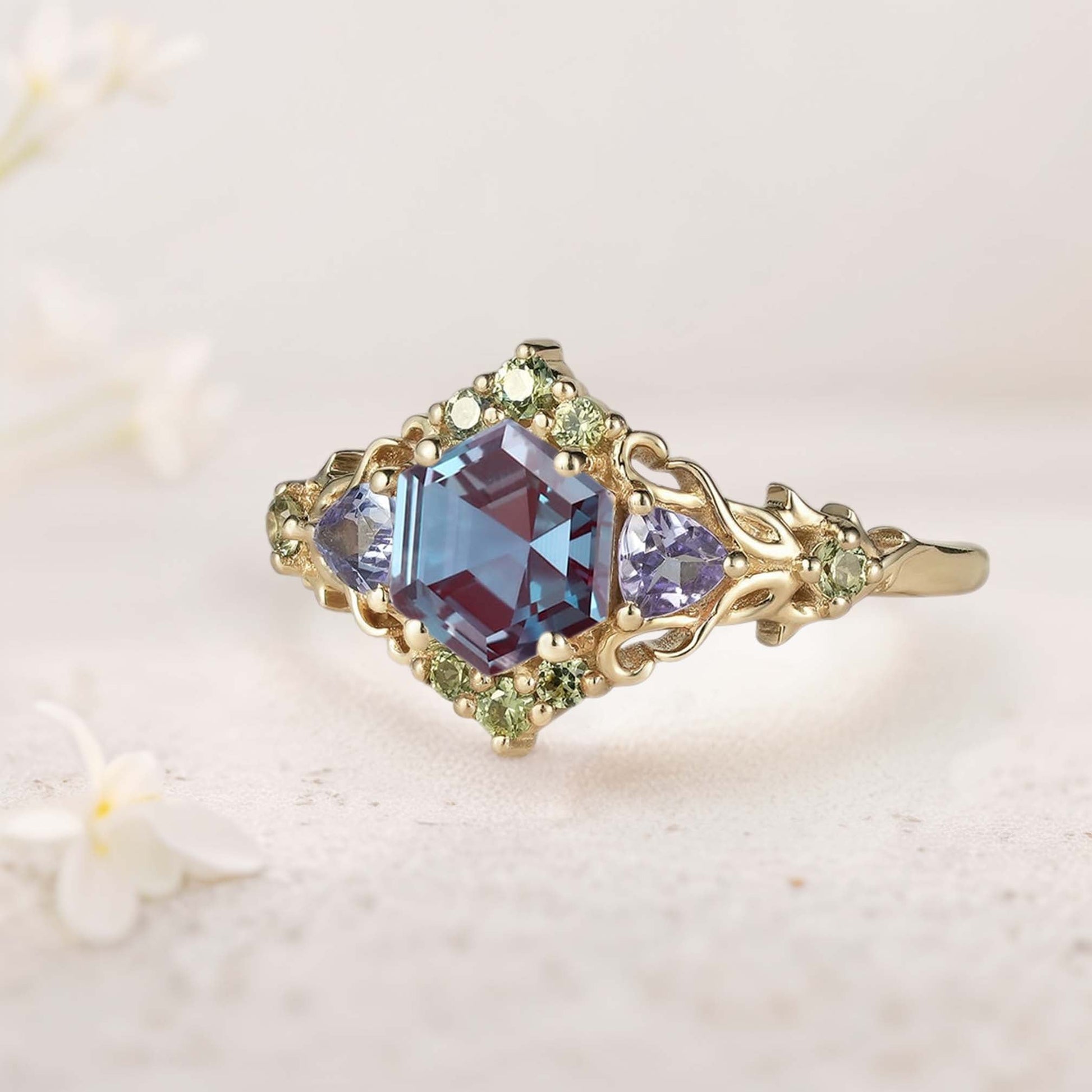 Unique floral engagement rings Three Stone Hexagon Lab Alexandrite and Blue sapphire Leaf Ring