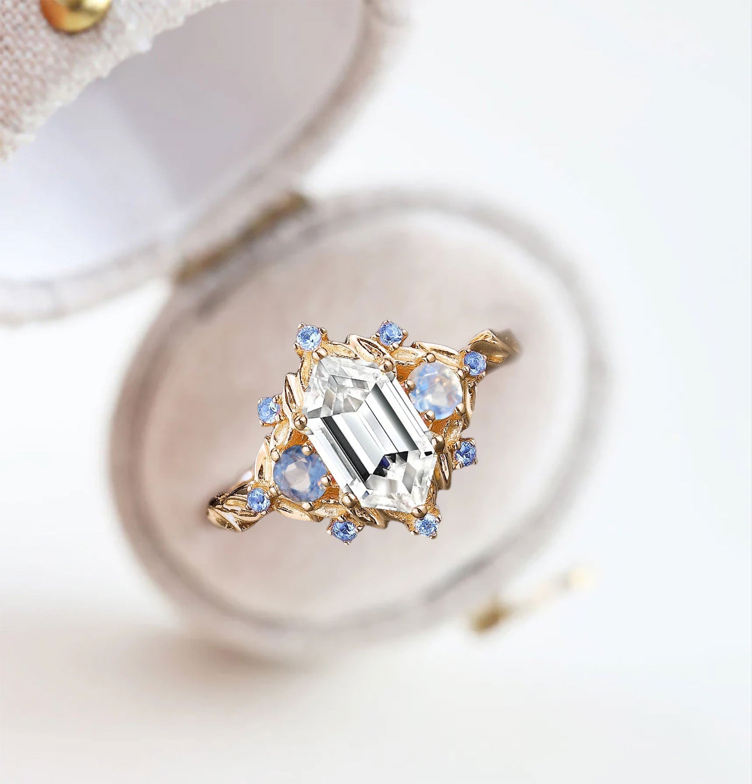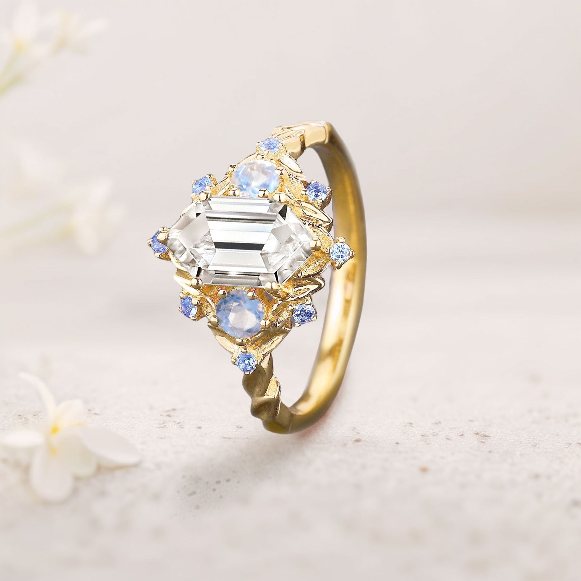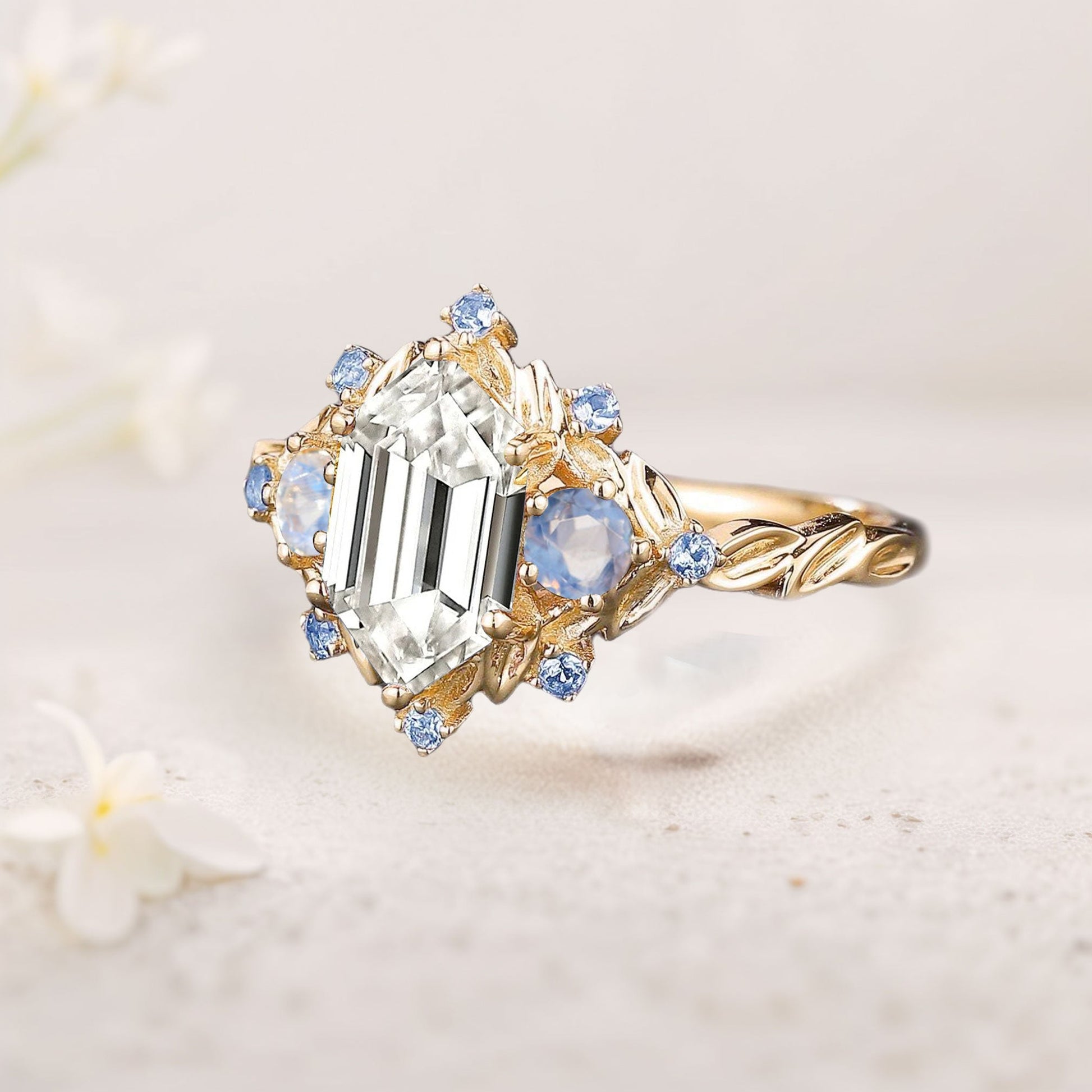 Unique floral engagement rings Three Stone Long Hexagon Moissanite Engagement Ring