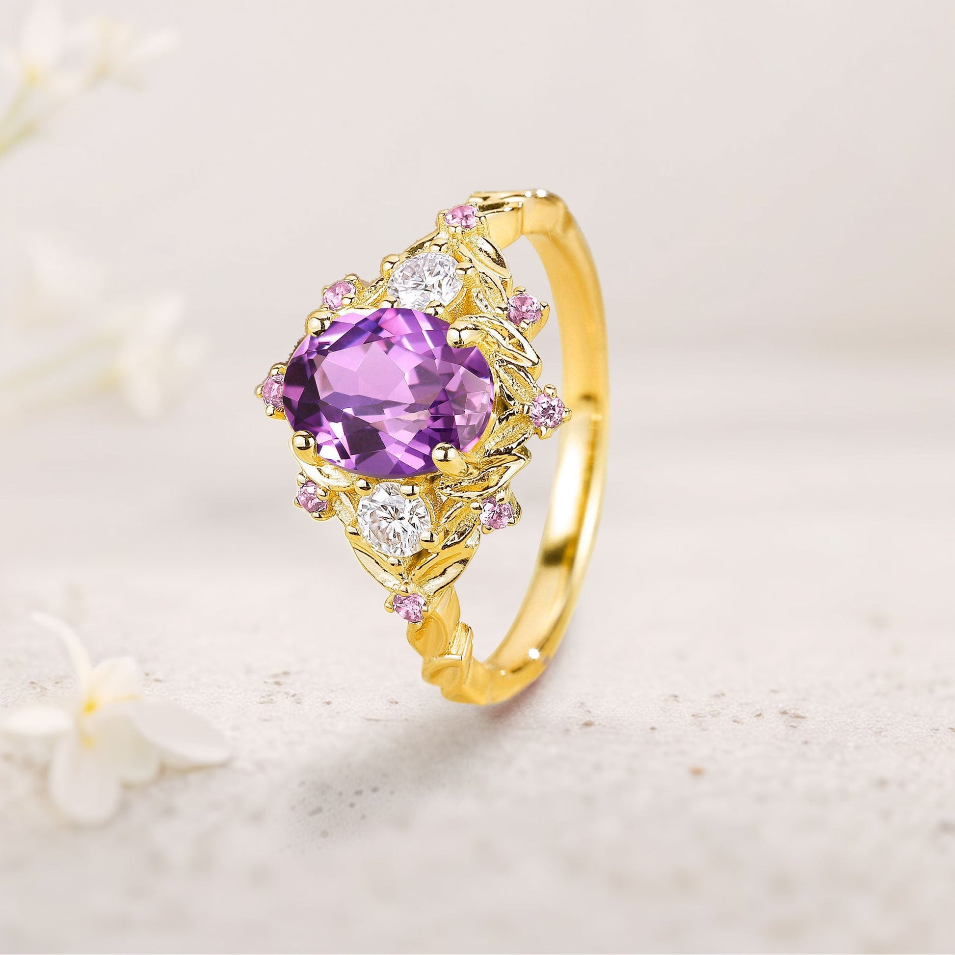 Unique Floral Three Stone Oval Amethyst Flower Engagement Ring Amethyst Cluster Bridal Ring