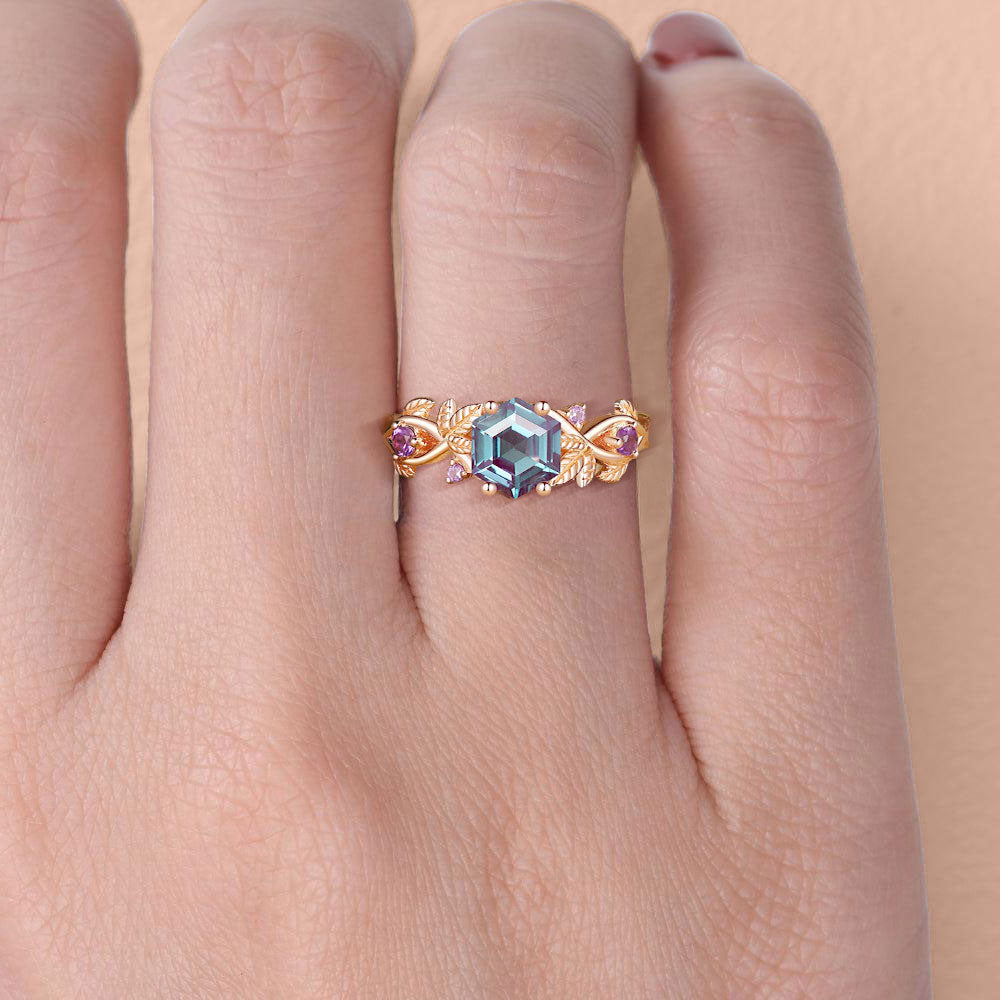 Unique floral engagement rings Hexagon Lab Alexandrite Leafy Engagement Ring