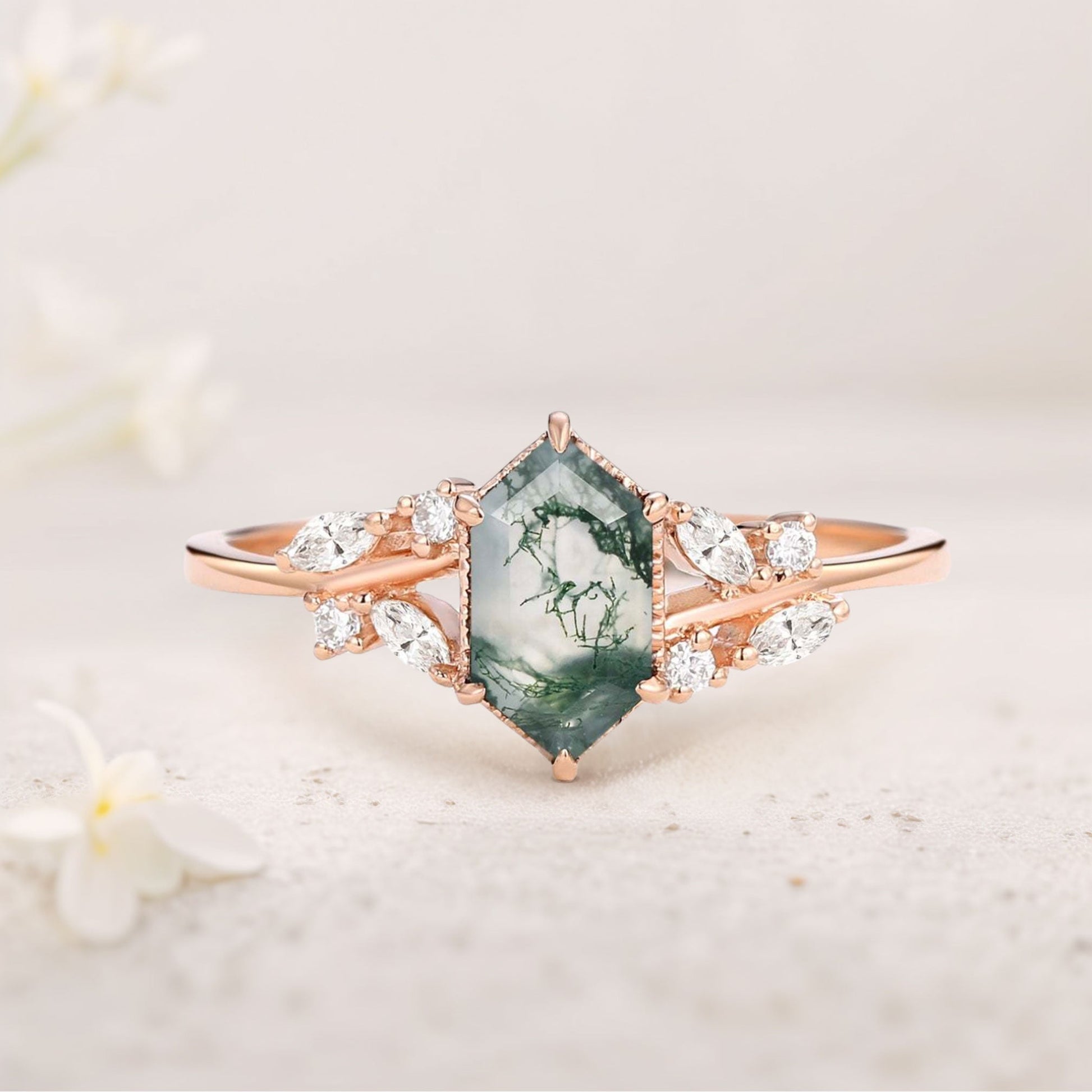 Unique floral engagement rings Hexagon Moss Agate Leafy Moissanite Vintage Engagement Ring