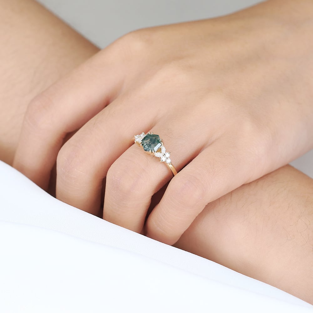 Unique Hexagon Moss Agate Simple Engagement Ring