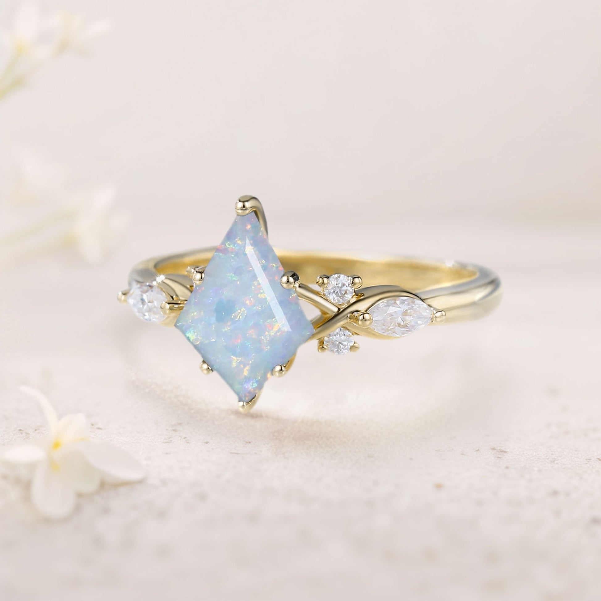 Unique Kite Lab Opal Engagement Ring Art Deco Promise Ring