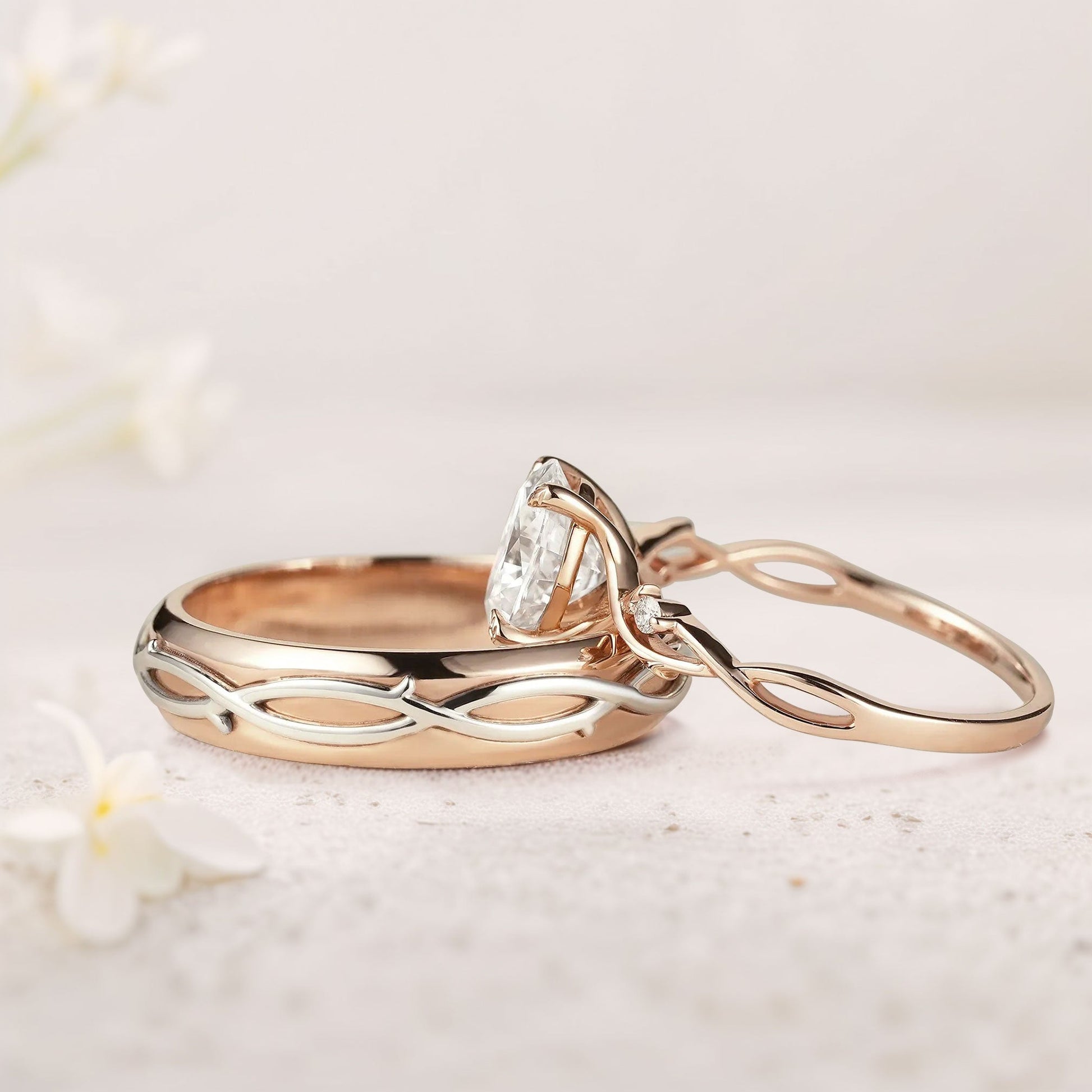 Unique Leaf Design Vine Oval Moissanite Couple’s Ring Set