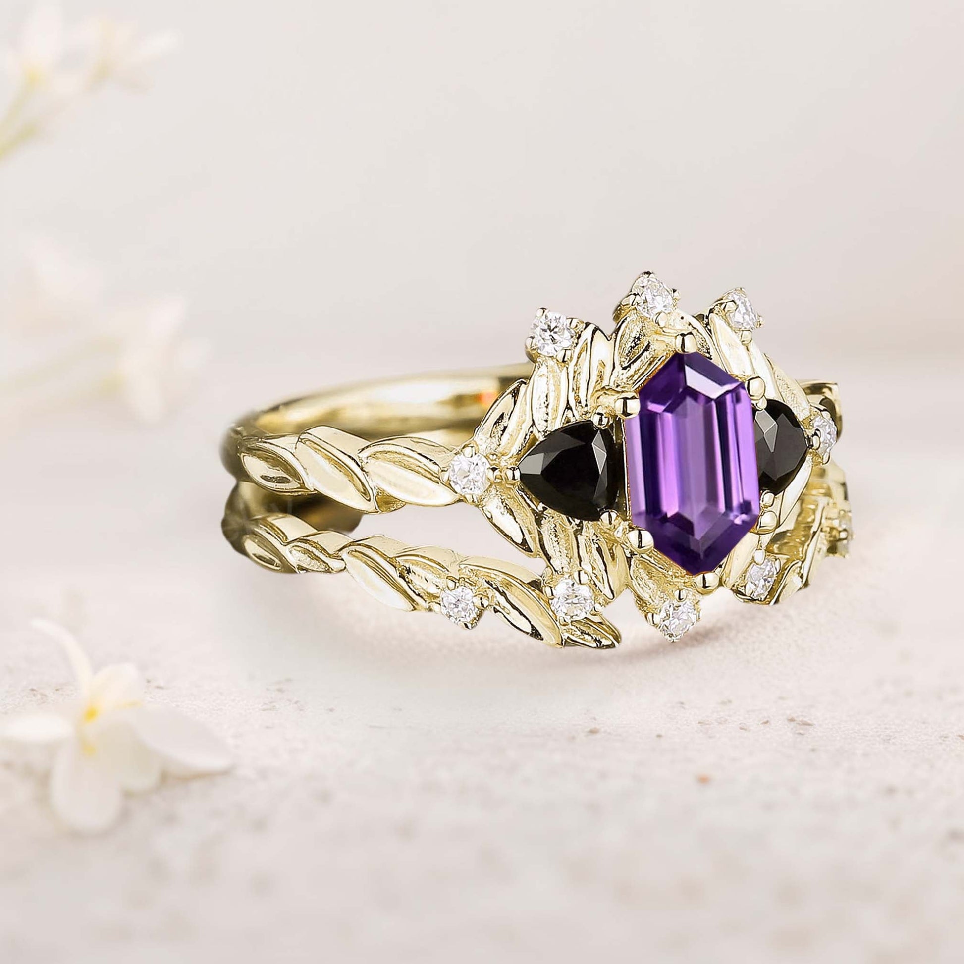 Unique floral engagement rings Long Hexagon Amethyst Leaf Engagement Ring Wedding Ring Set