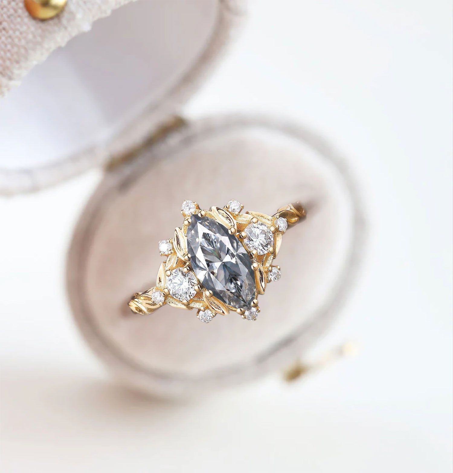 Unique floral engagement rings Marquise Gray Moissanite Ring Brilliant Moissanite Cluster Leaf Wedding Ring