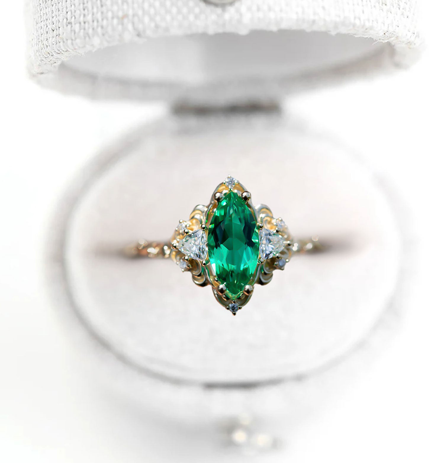 Unique Aurora Three Stone Marquise Lab Emerald Ring