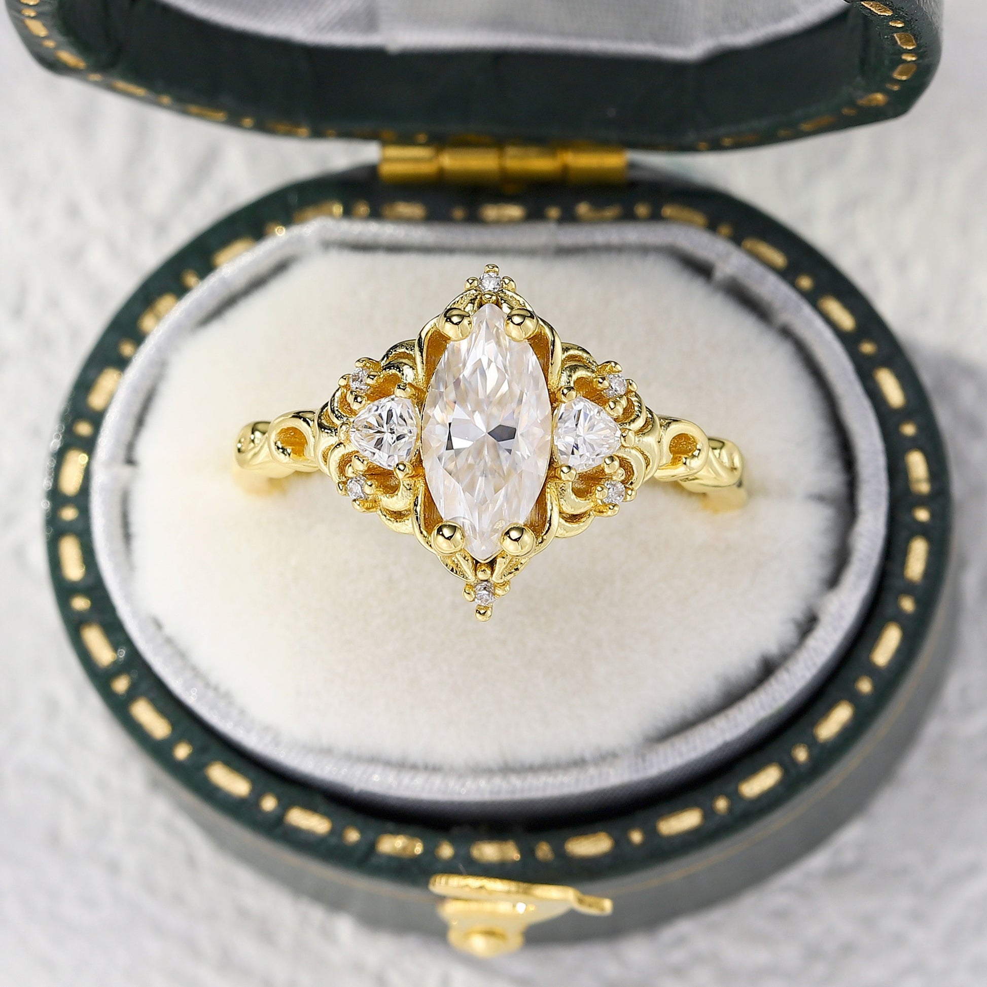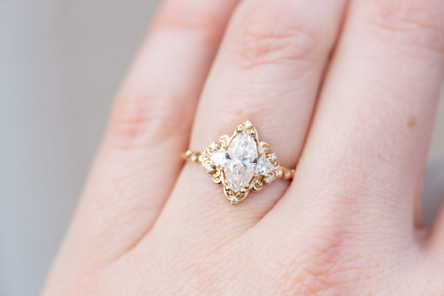 Unique Aurora Three Stone Marquise Moissanite Ring