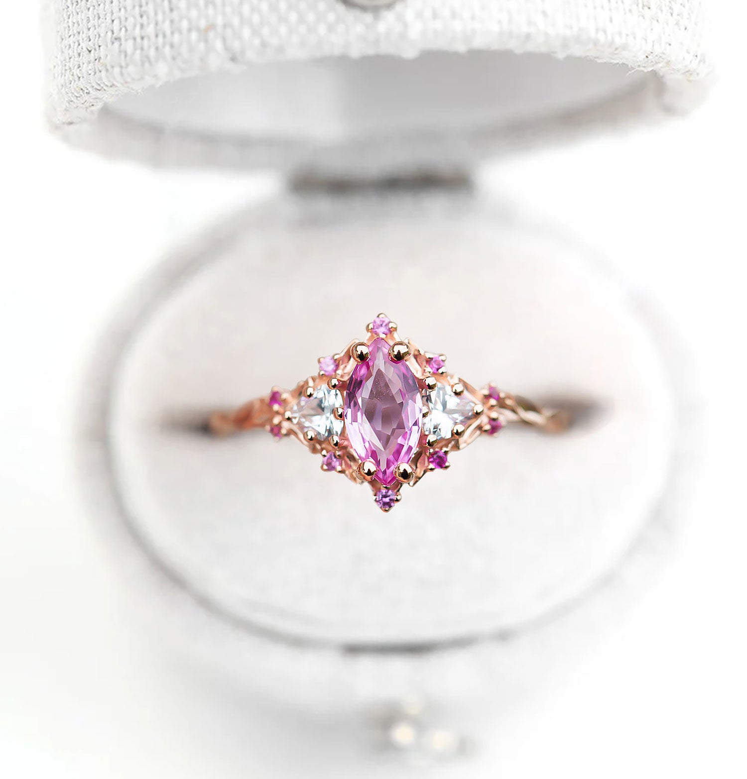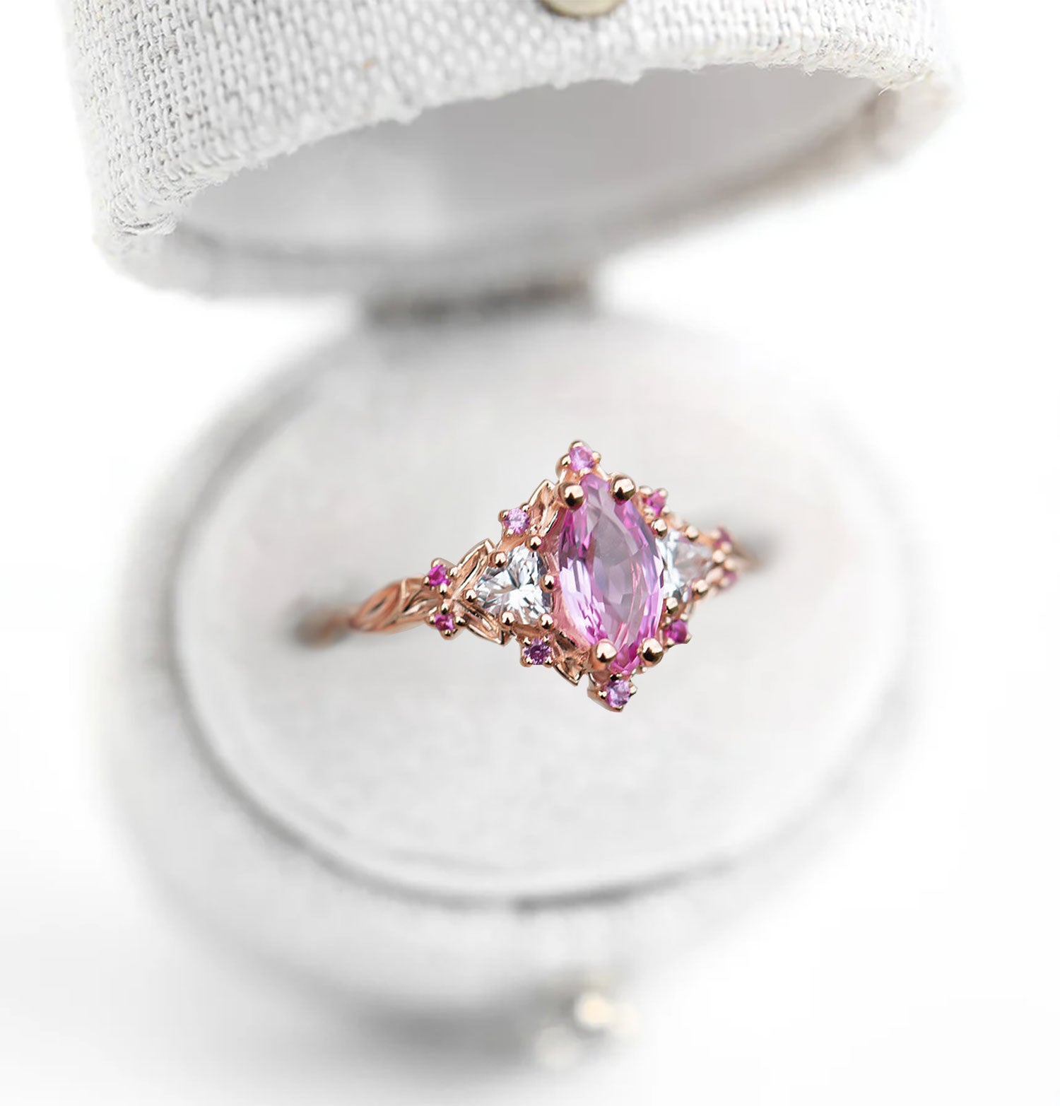 Unique Floral Rose Three Stone Marquise Pink Padparadscha and Moissanite Ring