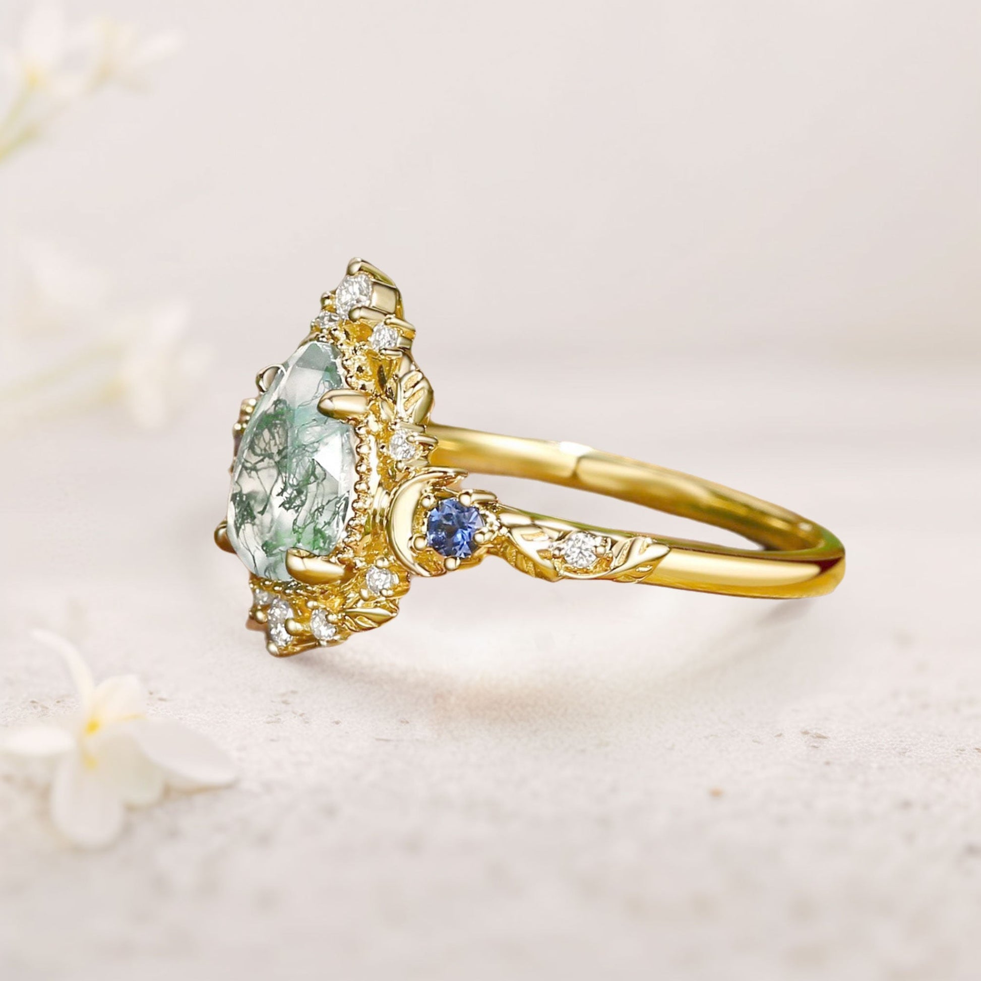 Unique floral engagement rings Moonlight Pear Moss Agate Engagement Ring