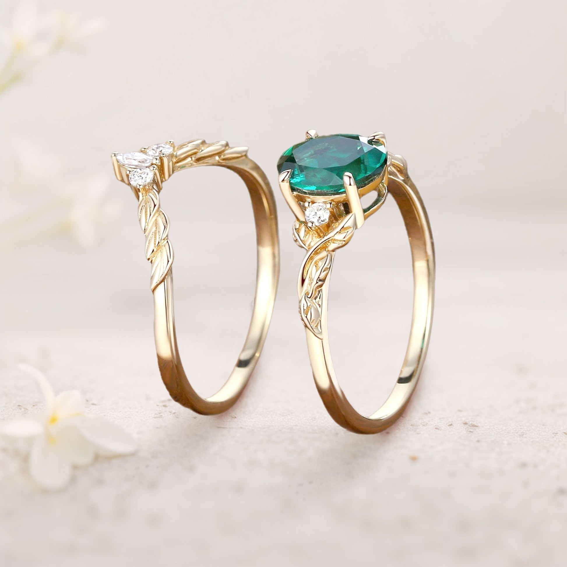 Unique floral engagement rings Nature Inspired Oval Lab Emerald Engagement Ring Set