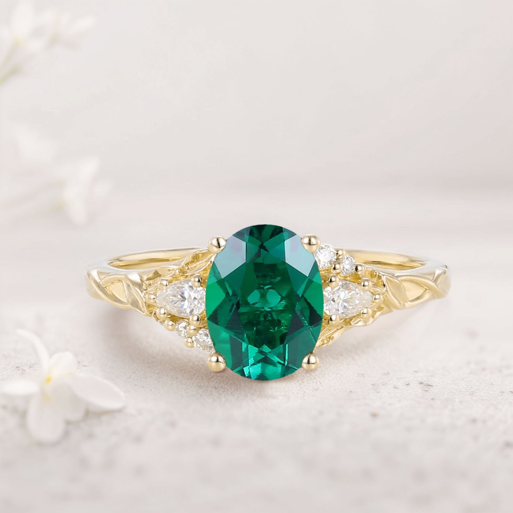 Unique Oval Lab Emerald and Moissanite Wedding Ring