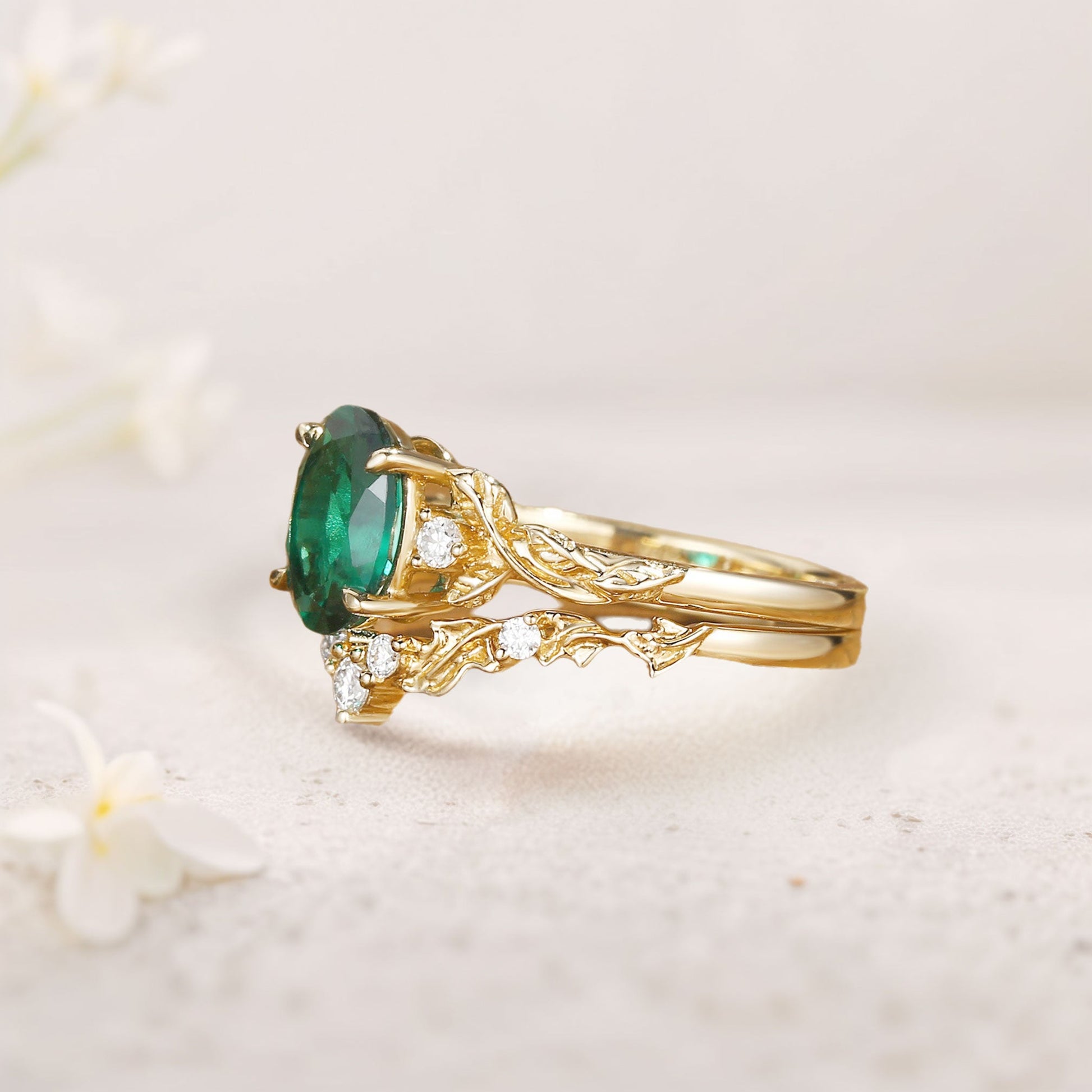 Unique floral engagement rings Oval Lab Emerald Leaf Branch Engagement Ring Set