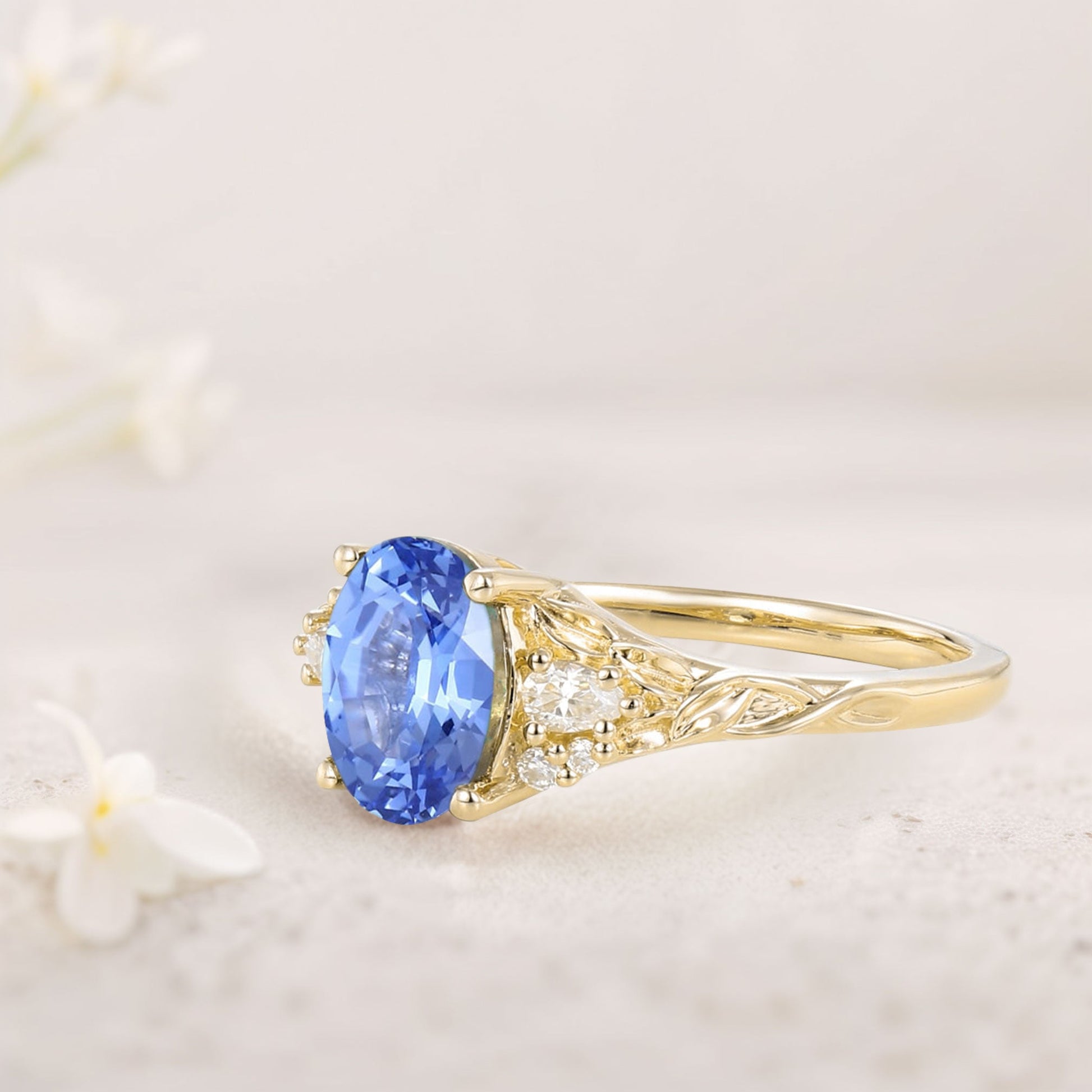 Unique Oval Lab Sapphire and Moissanite Wedding Ring