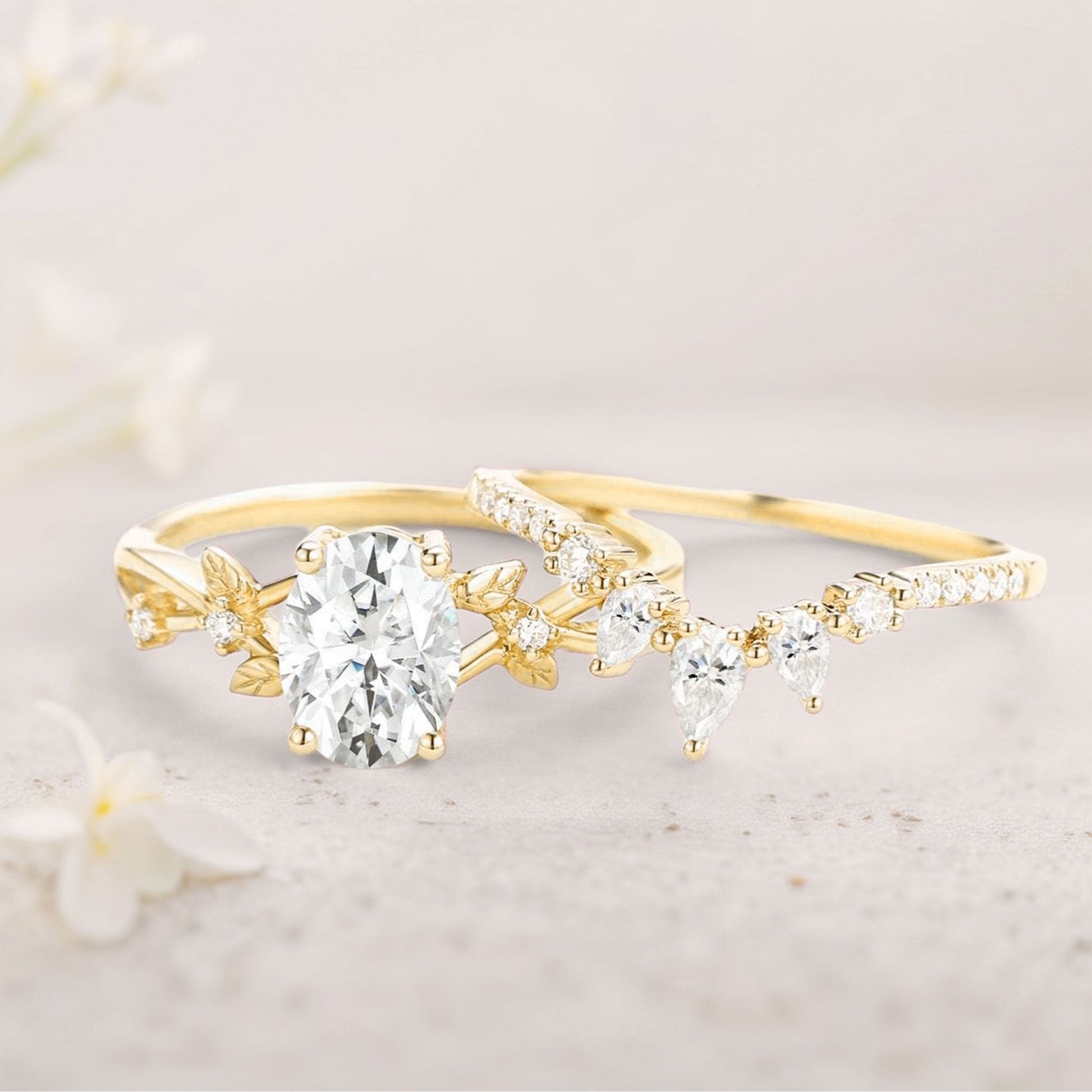 Unique floral engagement rings Oval Moissanite Leafy Wedding Ring Bridal Ring Set