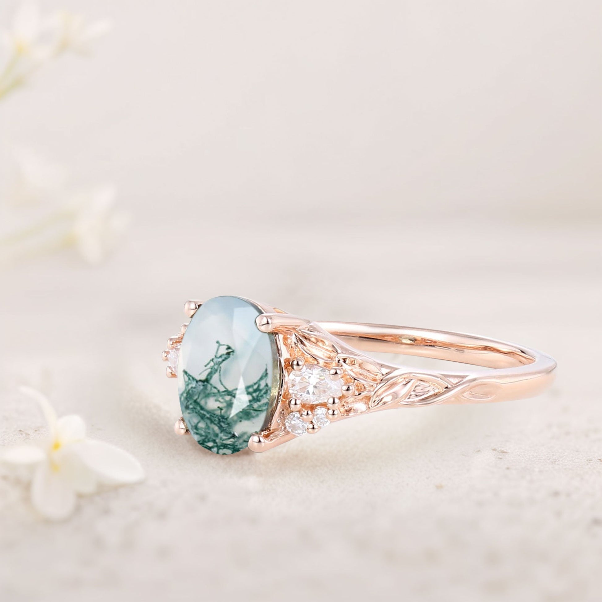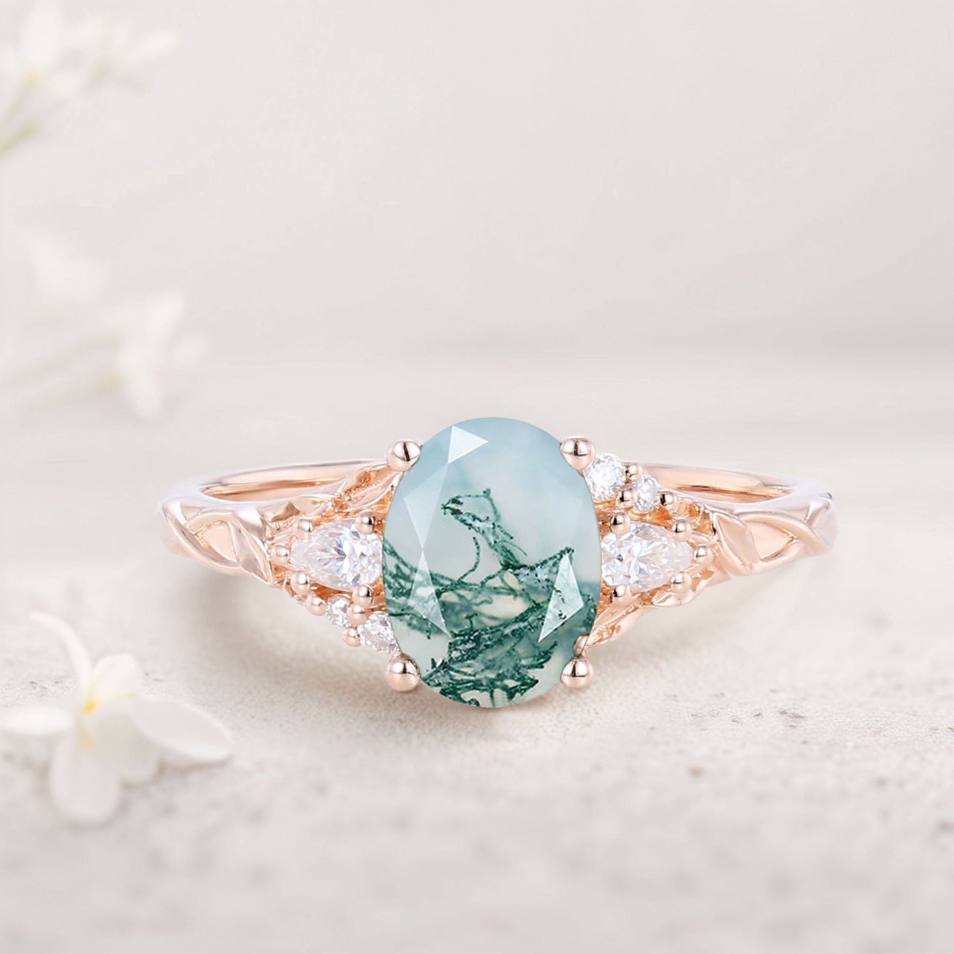 Unique Oval Moss Agate and Moissanite Wedding Ring