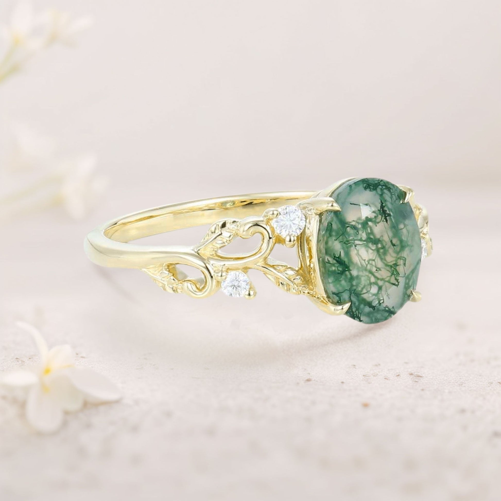 Unique floral engagement rings Oval Moss Agate Claw Engagement Ring Ornate Green Bridal Ring