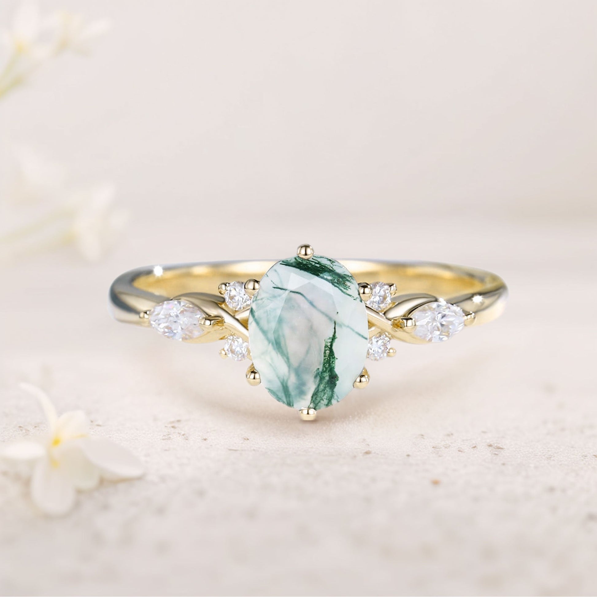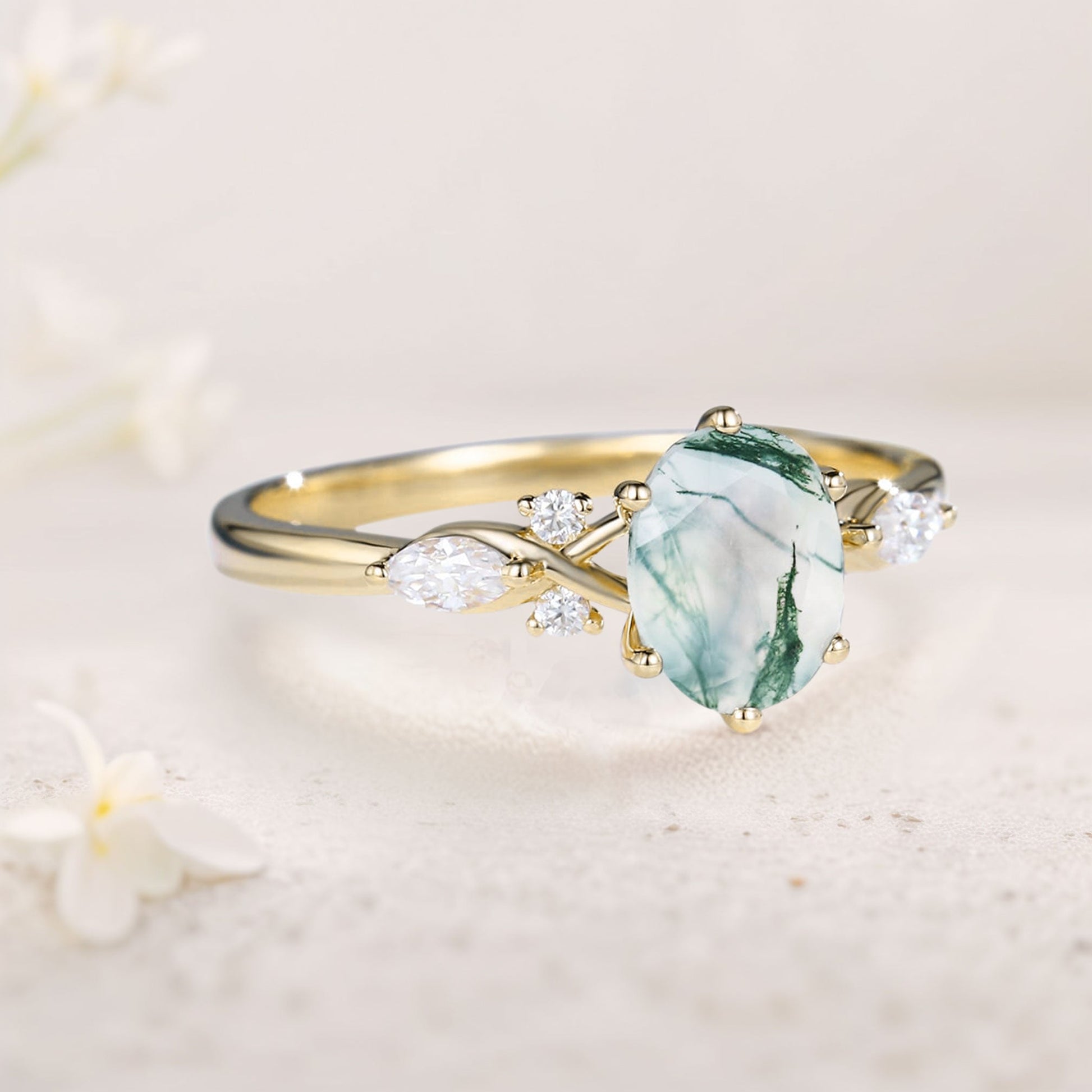 Unique Oval Moss Agate Twist Ring Engagement Ring