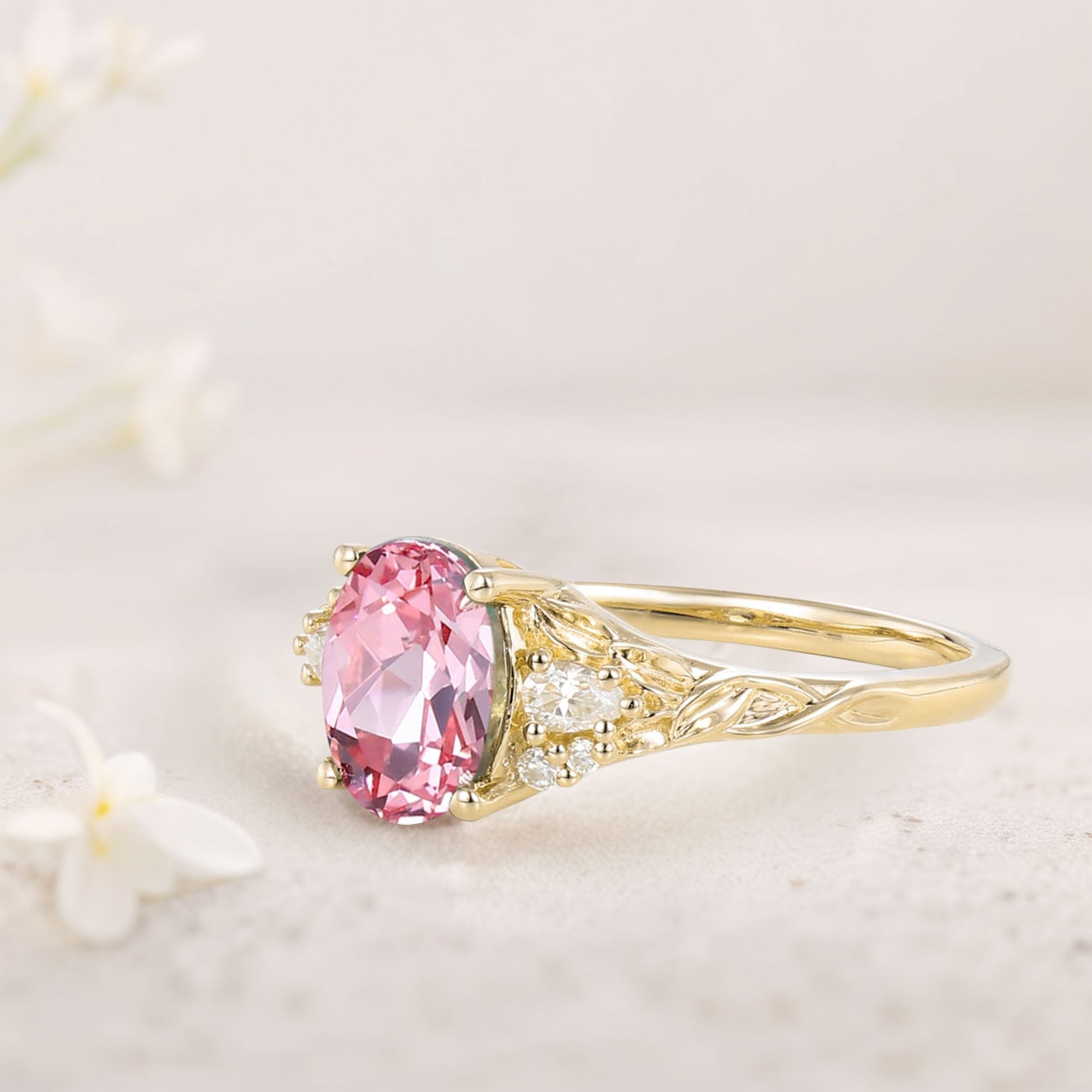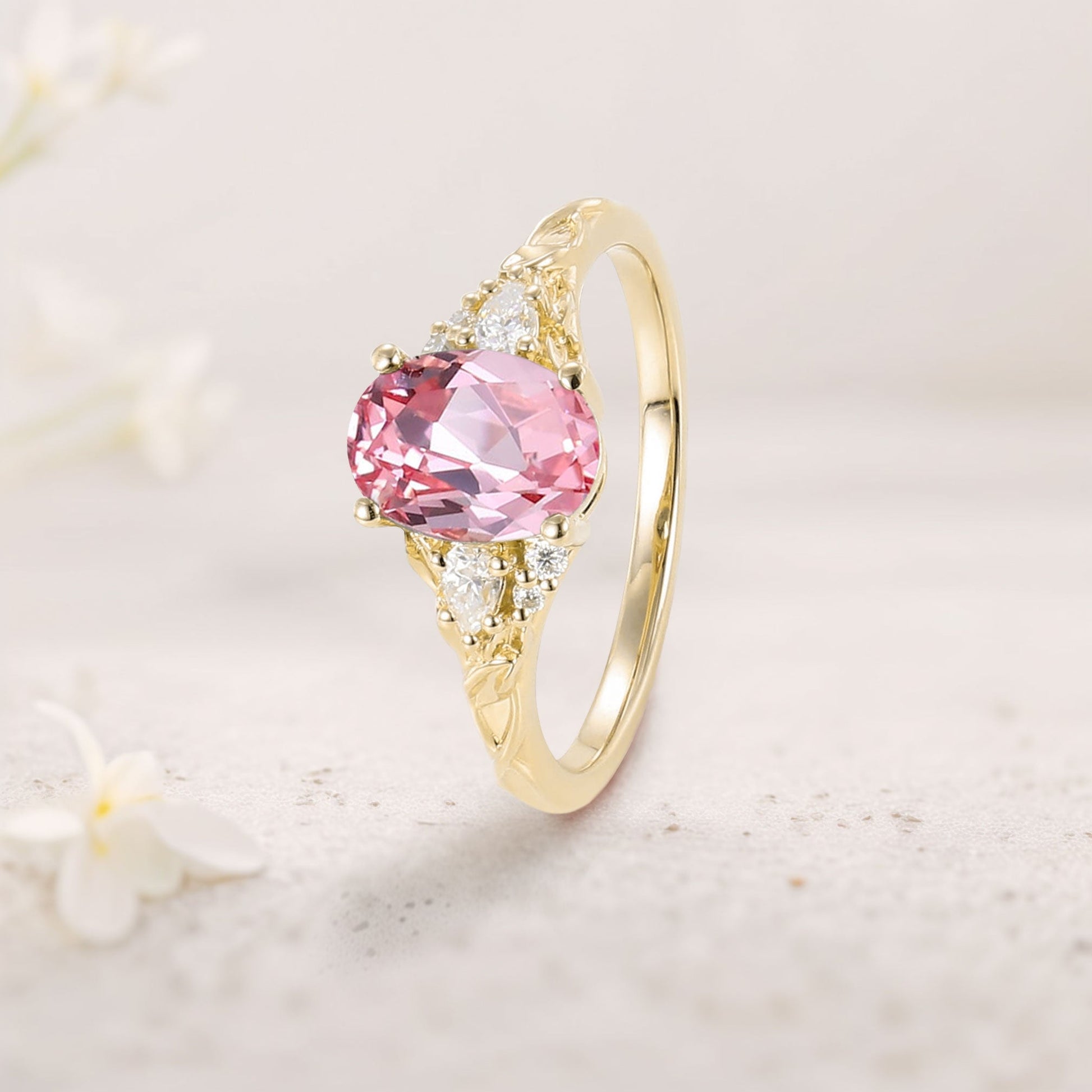 Unique Oval Pink Lab Padparadscha and Moissanite Wedding Ring