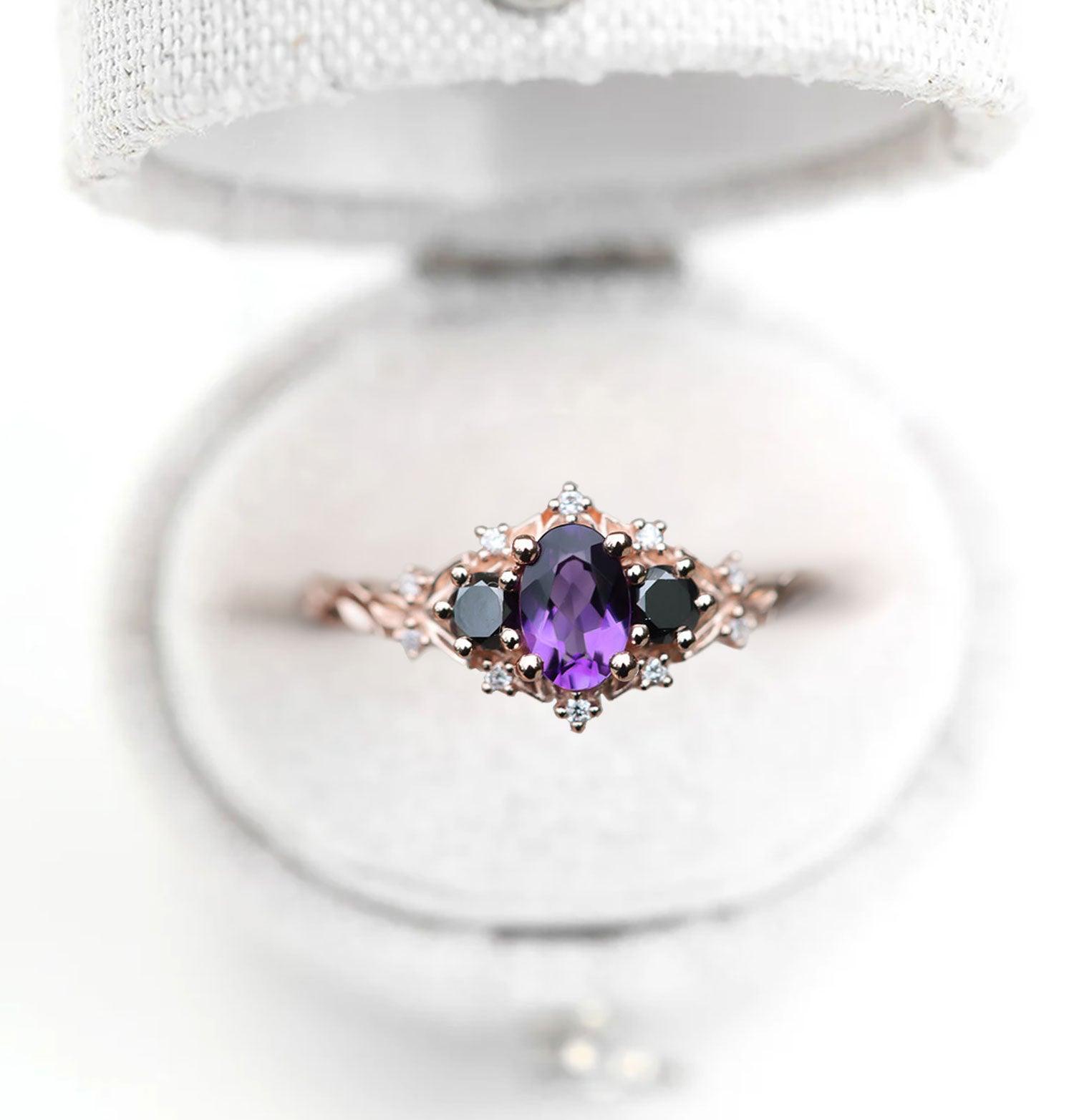 Unique Celeste Rose Three Stone Oval Amethyst and Black Moissanite Ring