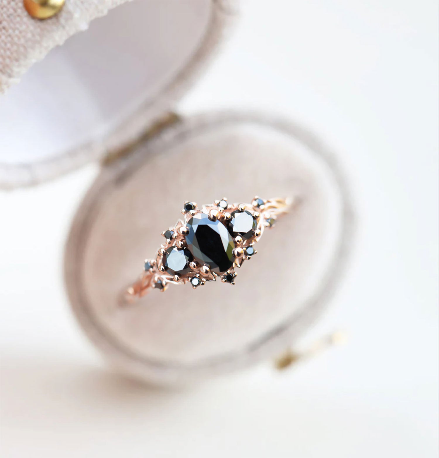 Unique Celeste Rose Three Stone Oval Black Moissanite Ring